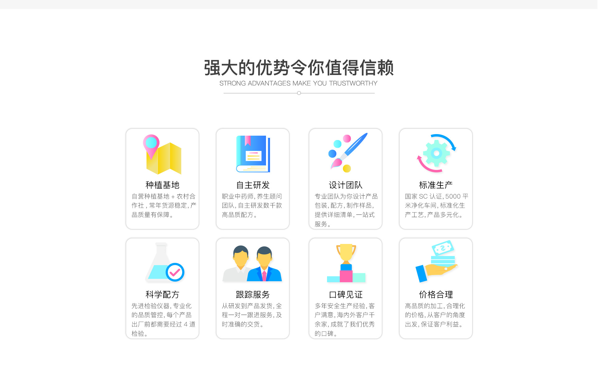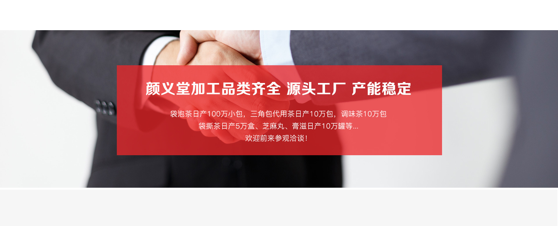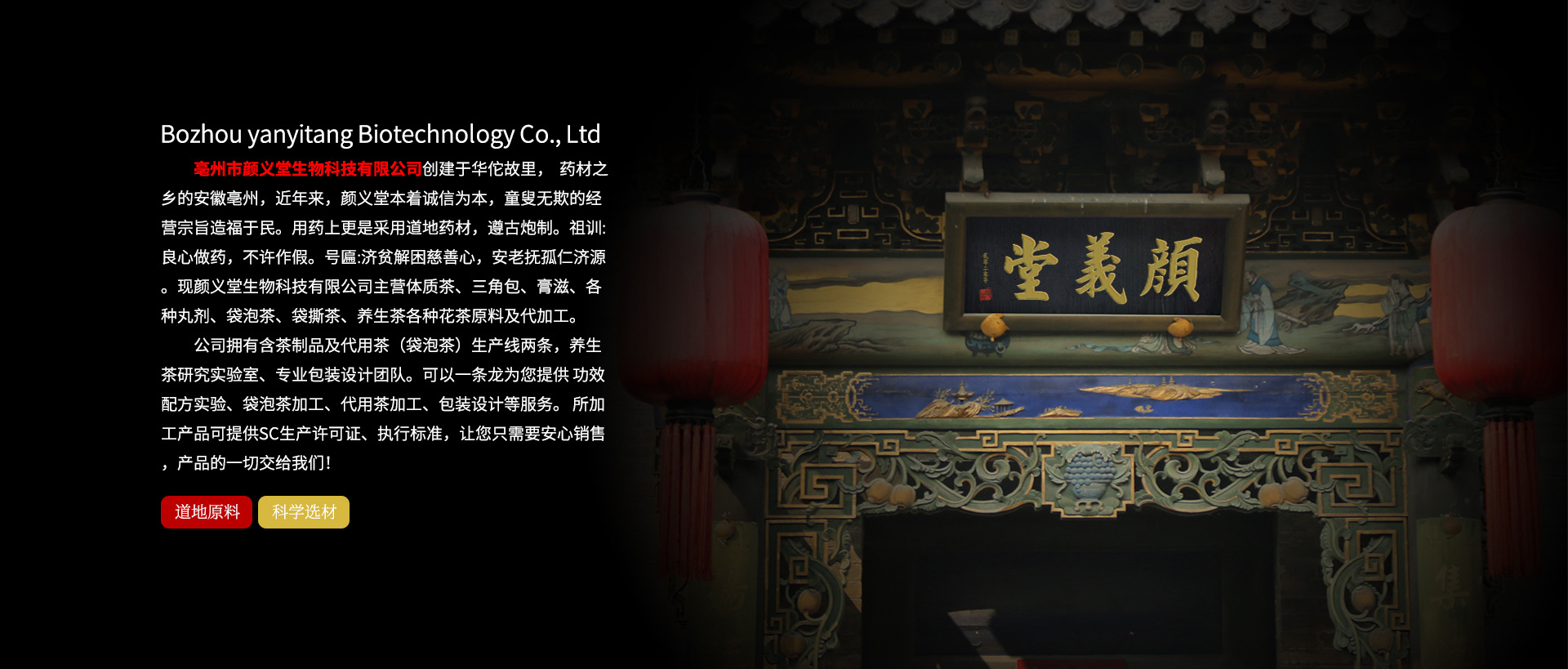 亳州市颜义堂生物科技有限公司 创建于华佗故里,  药材之乡的安徽亳州,近年来,颜义堂本着诚信为本,童叟无欺的经营宗旨造福于民。用药上更是采用道地药材,遵古炮制。祖训:良心做药,不许作假。号匾:济贫解困慈善心,安老抚孤仁济源。现颜义堂生物科技有限公司主营体质茶、三角包、水果片茶、袋泡、袋撕茶、养生茶、膏滋、丸剂代加工。公司拥有含茶制品及代用茶(袋泡茶)生产线两条,养生茶研究实验室、专业包装设计团队。可以一条龙为您提供功效配方实验、袋泡茶加工、代用茶加工、包装设计等服务。 所加工产品可提供SC生产许可证、执行标准,让您只需要安心销售,产品的一切交给我们!