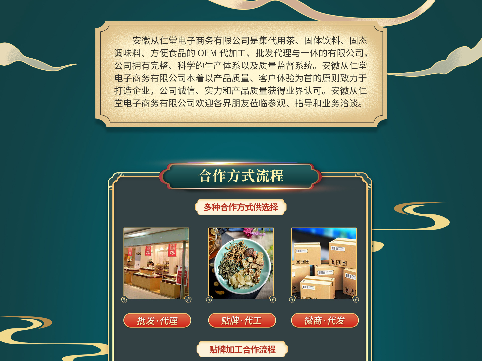 安徽从仁堂电子商务有限公司是集代用茶、固体饮料、固态调味料、方便食品的OEM代加工、批发代理与一体的有限公司,公司拥有完整、科学的生产体系以及质量监督系统。安徽从仁堂电子商务有限公司本着以产品质量、客户体验为首的原则致力于打造百年企业,公司诚信、实力和产品质量获得业界认可。安徽从仁堂电子商务有限公司欢迎各界朋友莅临参观、指导和业务洽谈。
