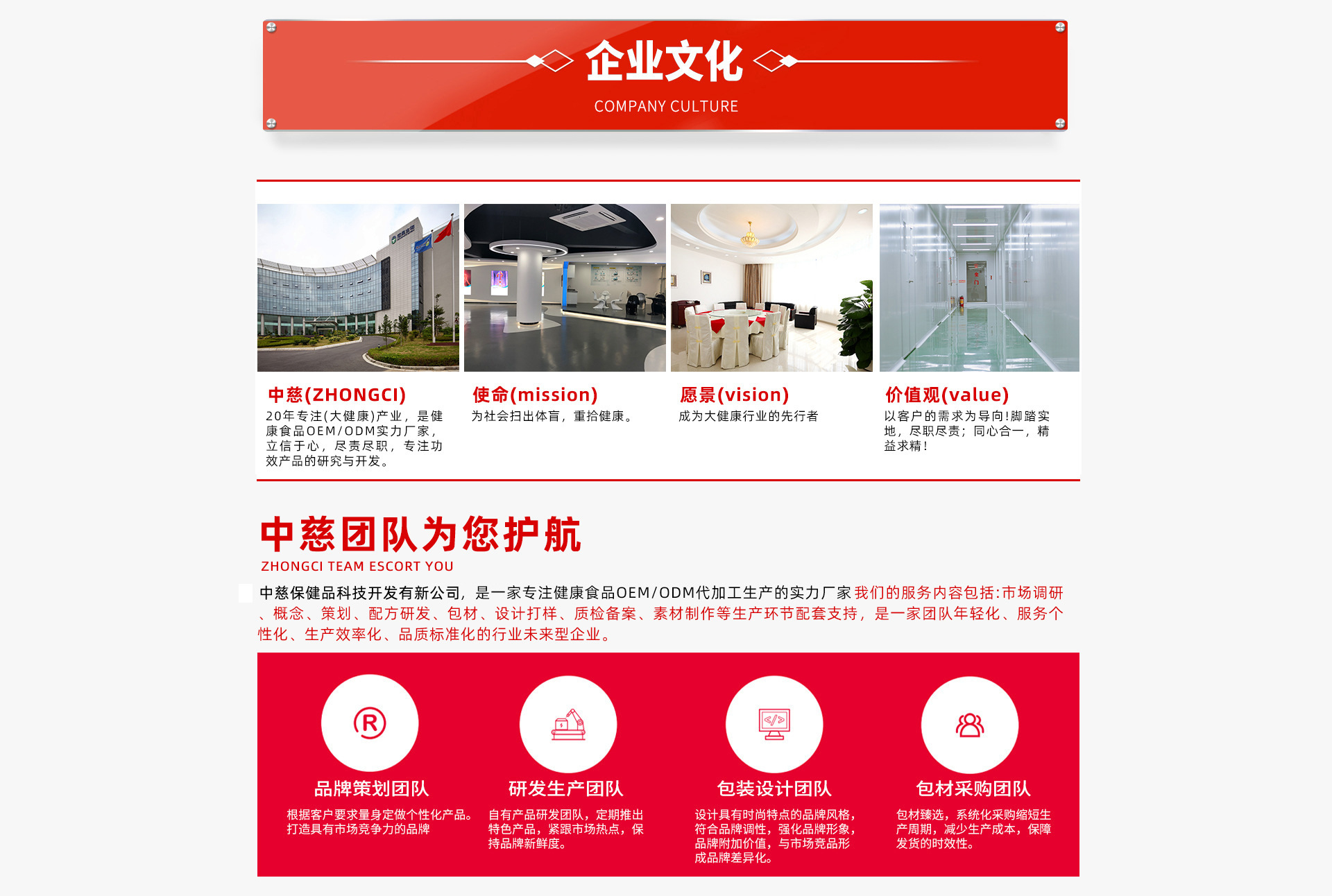 广州市中慈保健品有限公司位于美丽的花都区,主要生产食品,药食同源,保健食品,压片,粉剂,及各种代加工产品,中慈保健品科技开发有限公司是一家致力于研发、生产、销售为一体的技术创新型企业。公司成立于2015年,于2015年获得《食品生产许可证》。 公司配备了国内先进的生产和质检设备。主要有片剂、粉剂、颗粒剂等。片剂设计产能可达10亿粒,固体制剂设计产能可达5亿袋,粉剂、颗粒剂年产量均可达300吨以上。 公司目前生产中慈肽系列及各类营养食品系列。根据人体营养需求定向开发各类营养产品,致力于食品生物利用率、吸收率研发,使人体营养补充更方便快捷。 公司成立迄今,建立了一支产品研发、生产、质量检验、物流全产业链人才队伍。与国内多个知名大学医院合作,建立了比较完善的产、学、研、销体系。