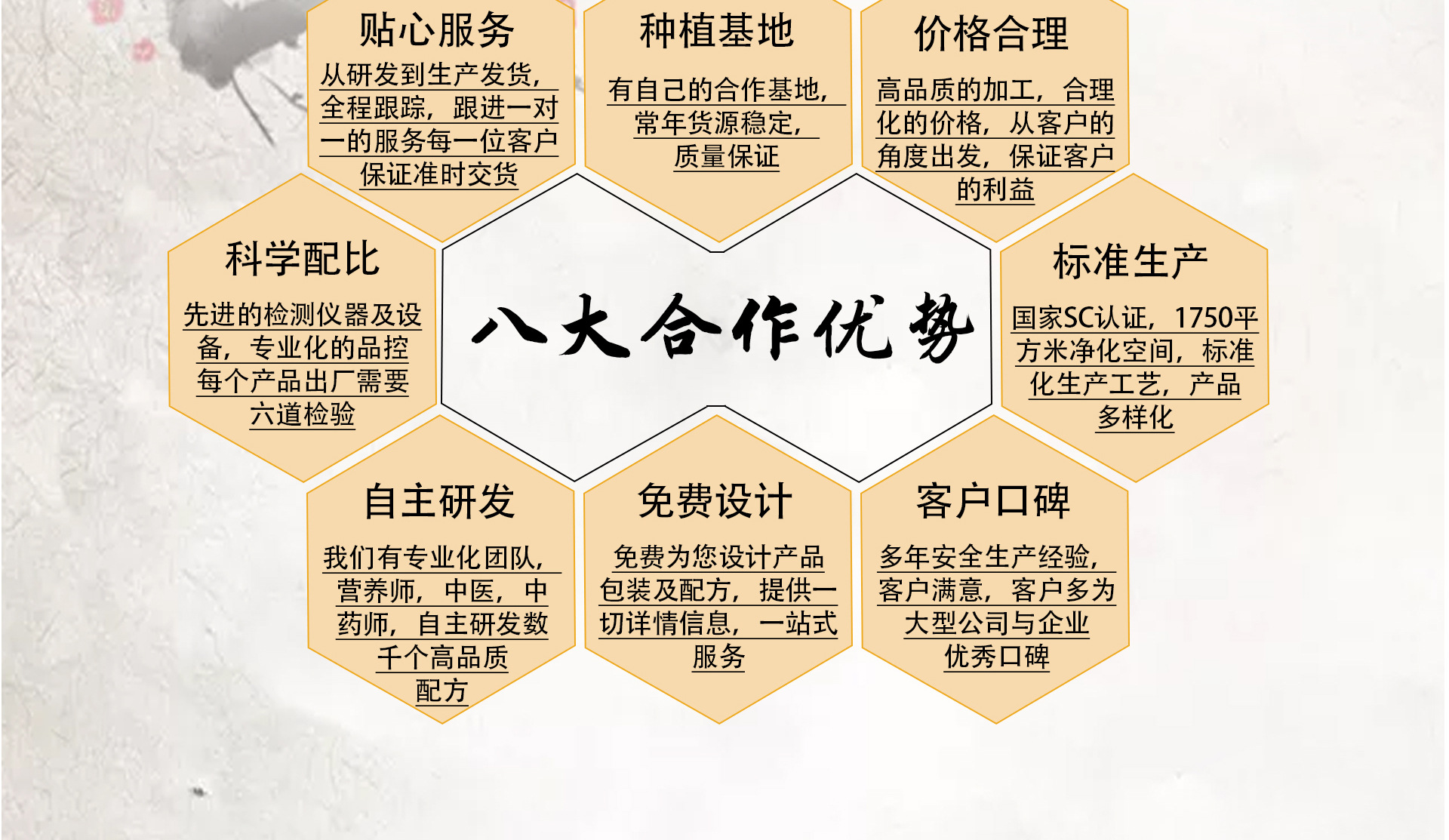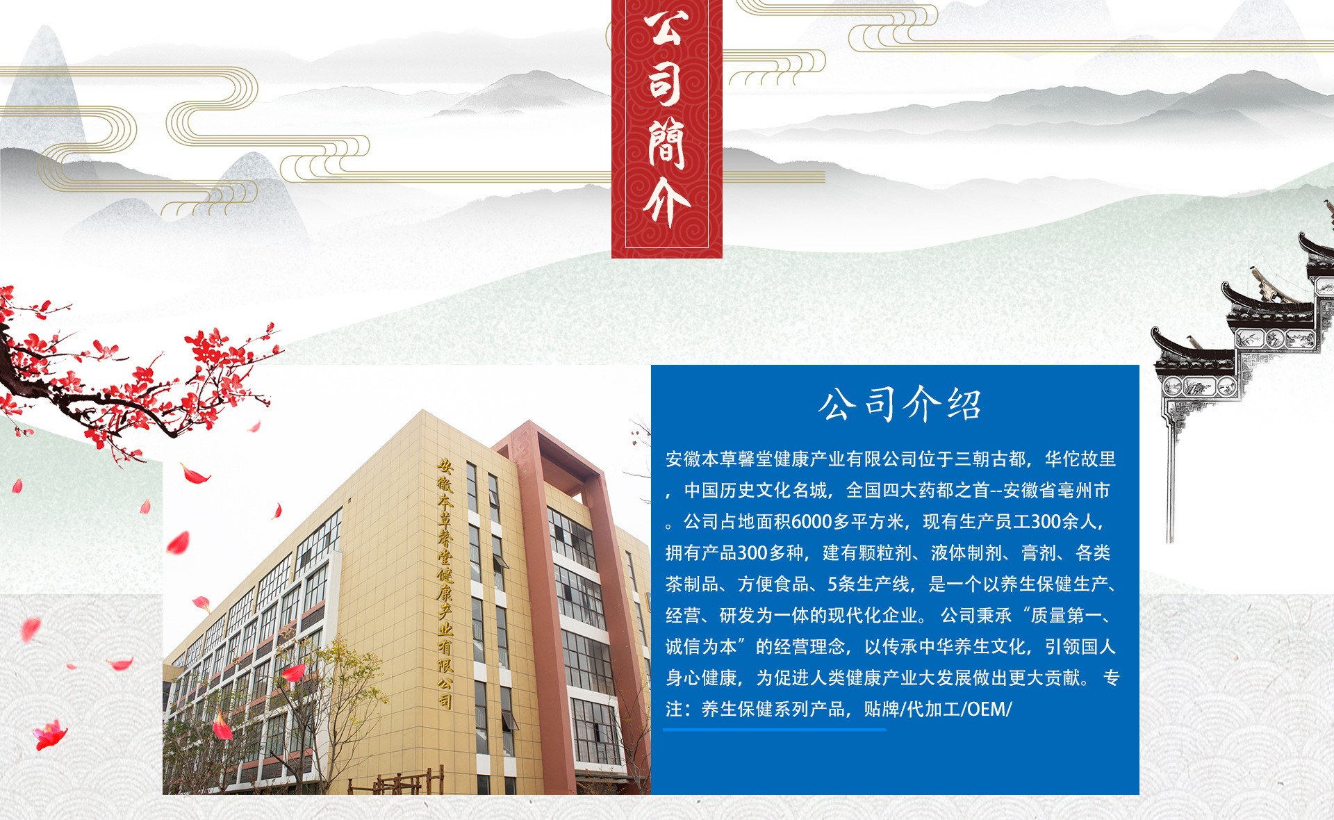 安徽本草馨堂健康产业有限公司位于三朝古都,四大药都之首,中国历史文化名城安徽亳州。公司面积约6000平方米,有生产员工近200人,产品300多种,建有压片糖果,膏剂,茶及相关制品,方便食品,糕点5条生产线。