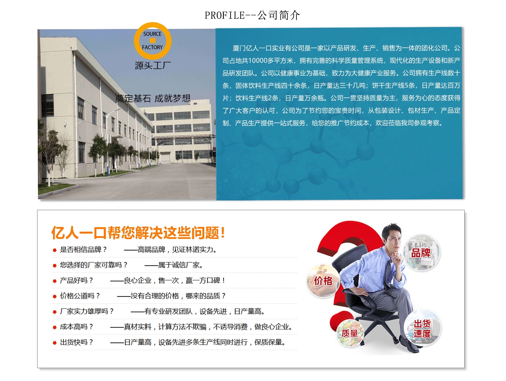 厦门亿人一口实业有限公司是隶属于厦门美滋颜集团旗下的其中一家分公司,是以研发、生产、加工大健康食品、化妆品、医疗器械等为主体的公司。我们一直秉承“通过不断技术创新,为客户提供质量过硬、最优质的产品,持续为客户创造价值,与客户共同发展”的首要使命,汇聚了业内精英专家研发团队,为每一位客户量身定制有特色的产品,打造一流的大健康产品品牌。
