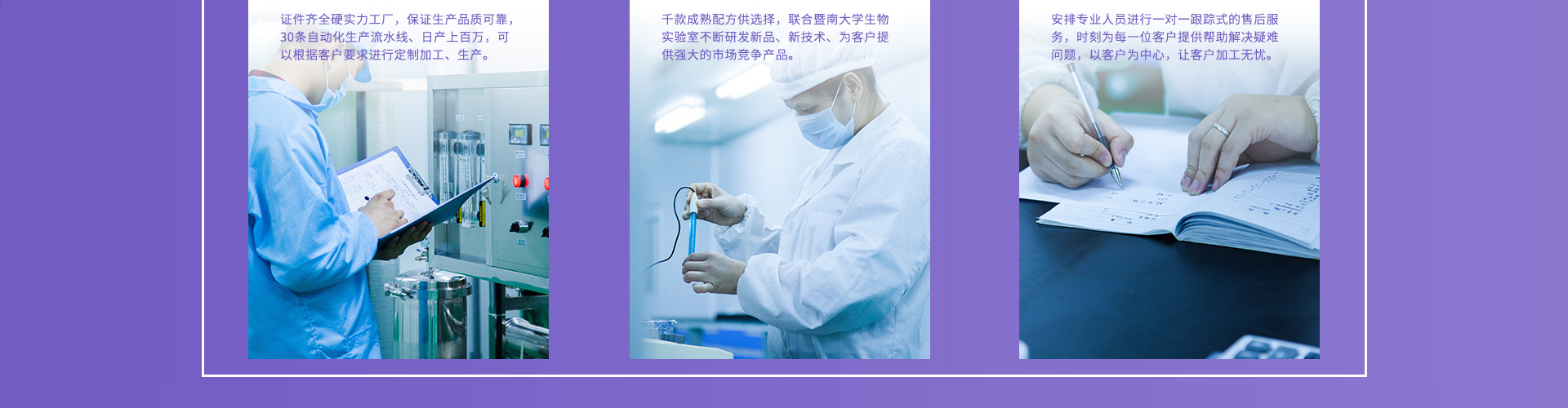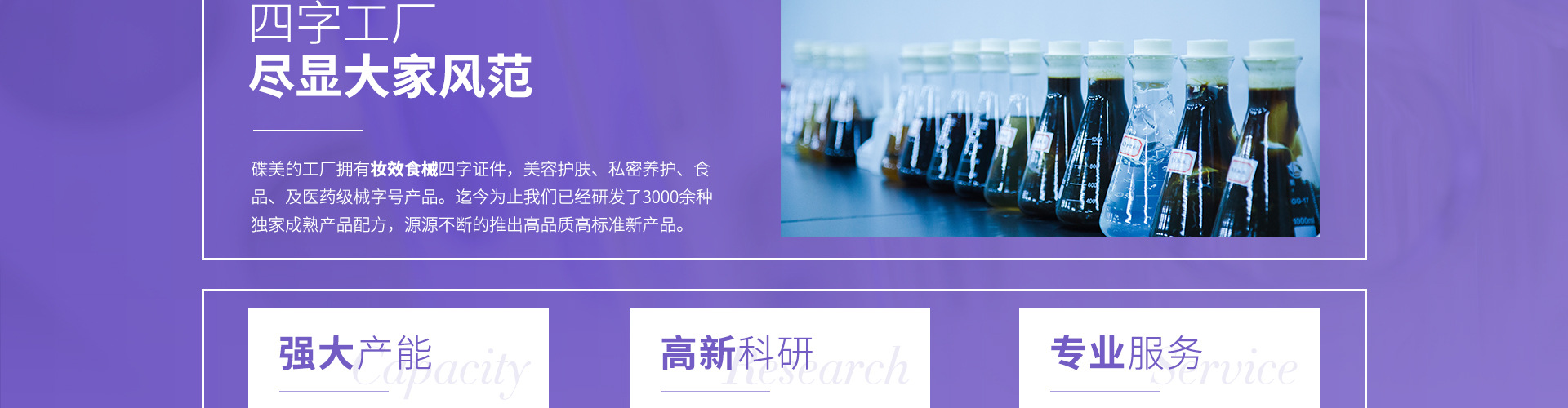 广州碟美生物技术有限公司是一家专业生产及销售的食品、化妆品、消字号产品、械字号工厂。拥有 20000平方10万级GMP车间 。 采用世界先进生产设备和医学、生物学技术资源以及进口天然原料产出高品质的化妆品。 在生产过程中根据不同材料及环境需要,采用紫外线消菌、酒精消毒、高温消菌及臭氧等多面结合的消菌方法保证包材的洁净和消菌,并为化妆品的品质提供了良好的环境保证。