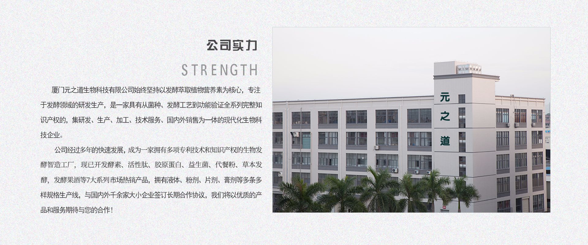 厦门元之道生物科技有限公司成立于2015年,坐落于福建省厦门市同安区,主要生产的产品类型为玻尿酸钠系列,代餐粉液系列,酵素液, 发酵果酒, 胶原蛋白肽系列, 酵素粉, 发酵草本系列, 小分子肽,植萃素,益生菌,拥有注册商标为元之道, 拥有研发设计师28人,打样工艺(制程)师25人(由生产人员兼任),专业质检人员13人,生产工人111人,生产设备共1486台。 企业使命/愿景/价值观: 构建全球一流的大健康+大农业生态典范公司+生物发酵产业化智造商
