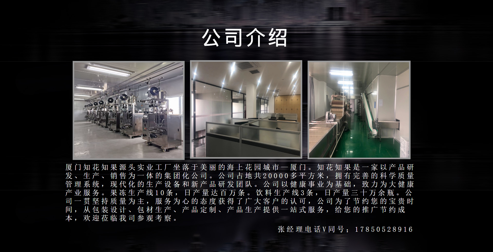 厦门知花知果源头实业工厂坐落于美丽的海上花园城市—厦门。知花知果是一家以产品研发、生产、销售为一体的集团化公司。公司占地共20000多平方米,拥有完善的科学质量管理系统,现代化的生产设备和新产品研发团队。公司以健康事业为基础,致力为大健康产业服务。果冻生产线10条,日产量达百万条。饮料生产线3条,日产量三十万余瓶。公司一贯坚持质量为主,服务为心的态度获得了广大客户的认可,公司为了节约您的宝贵时间,从包装设计、包材生产、产品定制、产品生产提供一站式服务,给您的推广节约成本,欢迎莅临我司参观考察。