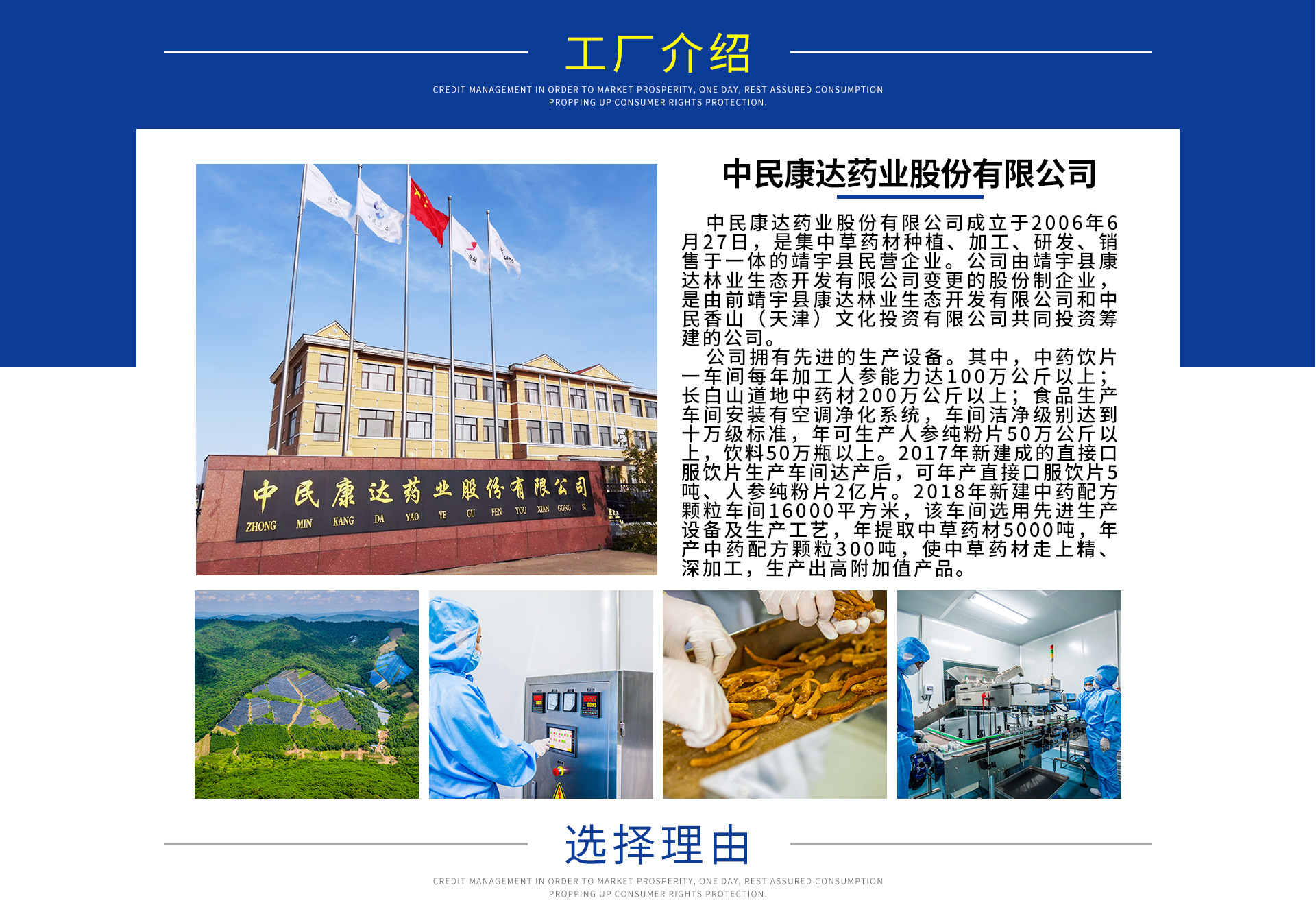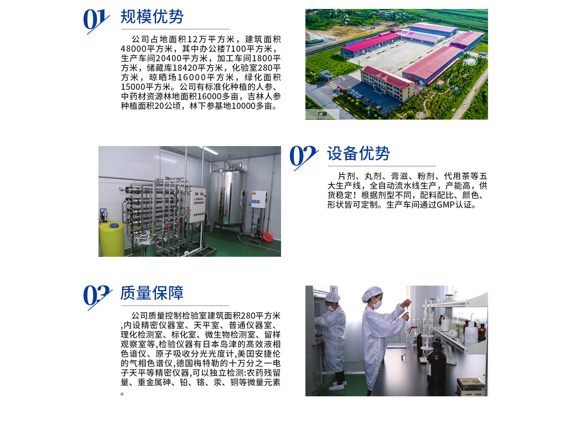 公司成立于2006年6月27日,注册资本8000万元,工厂建筑面积44200平方米,人参种植面积达20公顷。公司是长白山地区最大的特产种植、收购、仓储、精深加工基地。生产设备先进,技术成熟,可代加工生产丸剂、膏剂、压片糖果、代用茶、鹿产品、中药饮片等产品深加工。与敖东、靠山庄、修正等品牌达成战略合作。2015年被评为“吉林省农业产业化重点龙头企业”;2017年被评为“十佳优秀先进企业”2018年7月被省科技厅评定为吉林省科技小巨人企业;2018年9月被认定为国家高新技术企业