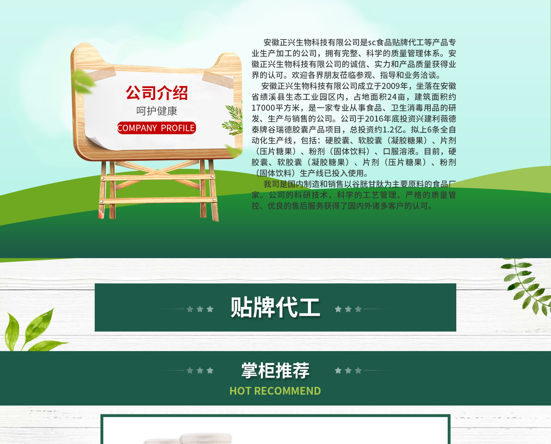 安徽正兴生物科技有限公司成立于2009年,坐落在安徽省绩溪县生态工业园区内,占地面积24亩,建筑面积约17000平方米,是一家专业从事保健食品、食品、卫生消毒用品的研发、生产与销售的公司。 公司于2016年底投资兴建利薇德泰牌谷瑞德胶囊产品项目,总投资约1.2亿。拟上8条全自动化生产线,包括:硬胶囊、软胶囊(凝胶糖果)、片剂(压片糖果)、粉剂(固体饮料)、袋泡茶、口服溶液。目前,硬胶囊、软胶囊(凝胶糖果)、片剂(压片糖果)、粉剂(固体饮料)、袋泡茶生产线已投入使用。 我司是国内首家制造和销售以谷胱甘肽为主要原料的保健食品厂家。公司以权威的科研技术、科学的工艺管理、严格的质量管控、优质的售后服务获得了国内外诸多客户的认可。