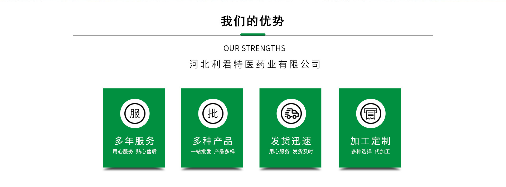 河北利君特医药业有限公司是等产品专业生产加工的公司,拥有完整、科学的质量管理体系。河北利君特医药业有限公司的诚信、实力和产品质量获得业界的认可。欢迎各界朋友莅临参观、指导和业务洽谈。