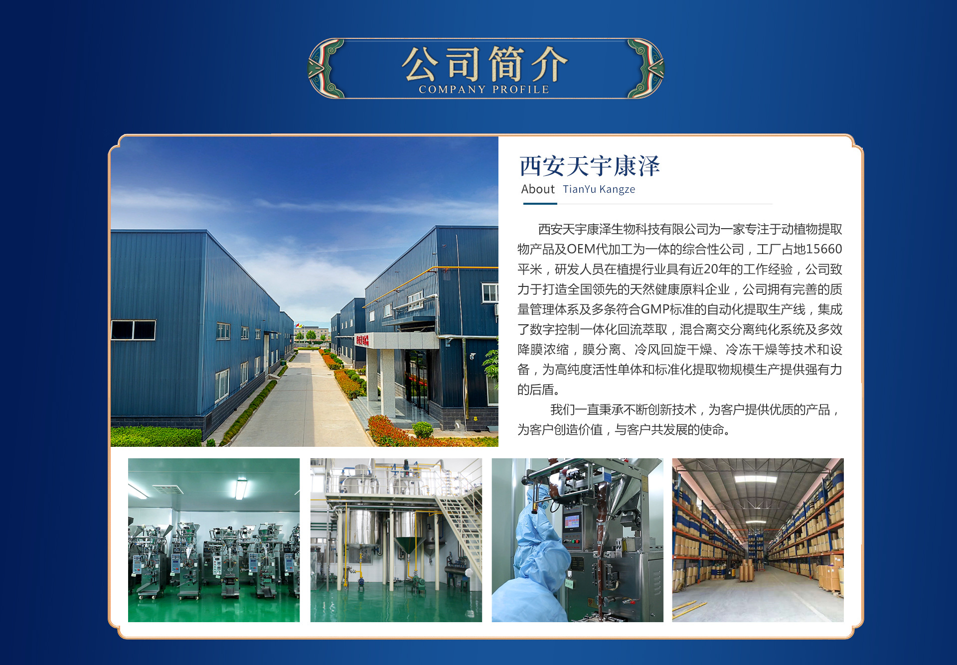 西安天宇康泽生物科技有限公司为一家专注于动植物提取物产品及OEM代加工为一体的综合性公司,工厂占地15660平米,研发人员在植提行业具有近20年的工作经验,公司致力于打造全国领先的天然健康原料企业,公司拥有完善的质量管理体系及多条符合GMP标准的自动化提取生产线,集成了数字控制一体化回流萃取,混合离交分离纯化系统及多效降膜浓缩,膜分离、冷风回旋干燥、冷冻干燥等技术和设备,为高纯度活性单体和标准化提取物规模生产提供强有力的后盾。 我们一直秉承不断创新技术,为客户提供优质的产品,为客户创造价值,与客户共发展的使命。