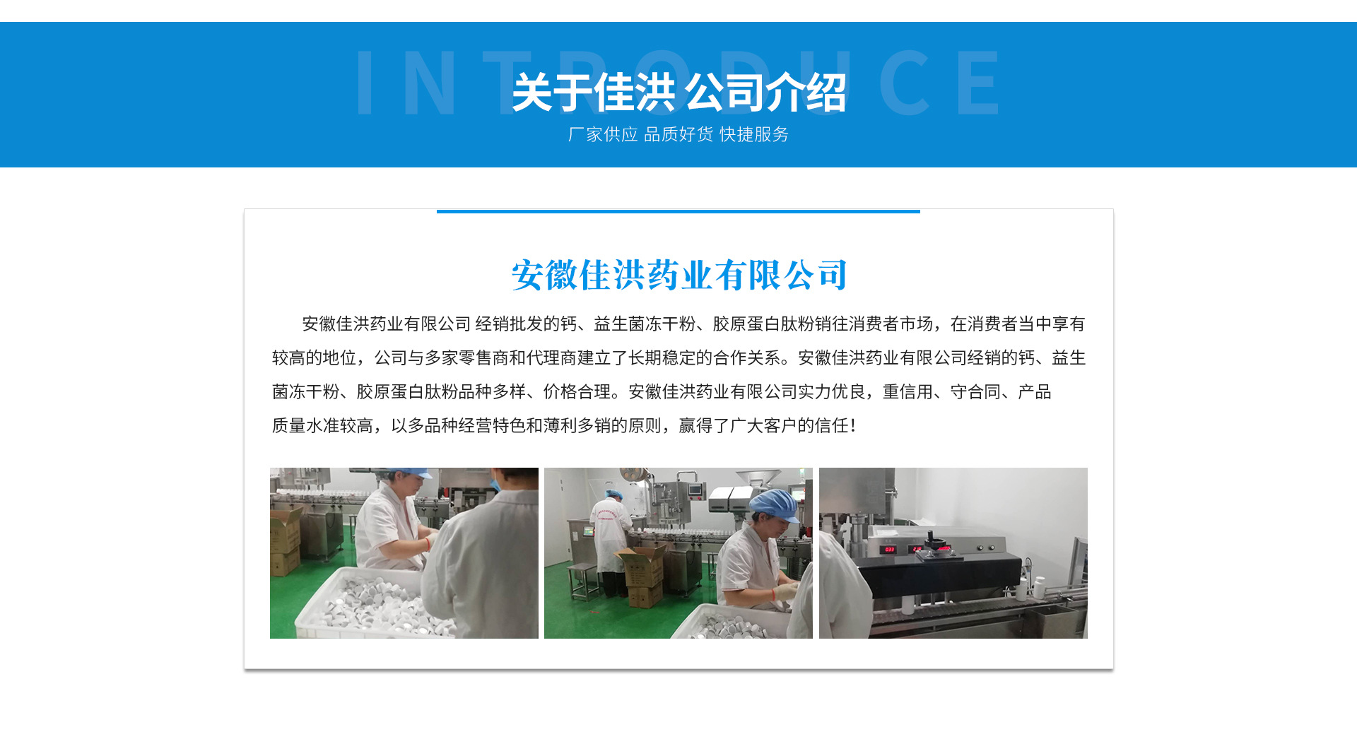 安徽佳洪药业有限公司 经销批发的钙、益生菌冻干粉、胶原蛋白肽粉畅销消费者市场,在消费者当中享有较高的地位,公司与多家零售商和代理商建立了长期稳定的合作关系。安徽佳洪药业有限公司经销的钙、益生菌冻干粉、胶原蛋白肽粉品种齐全、价格合理。安徽佳洪药业有限公司实力雄厚,重信用、守合同、有产品质量,以多品种经营特色和薄利多销的原则,赢得了广大客户的信任。