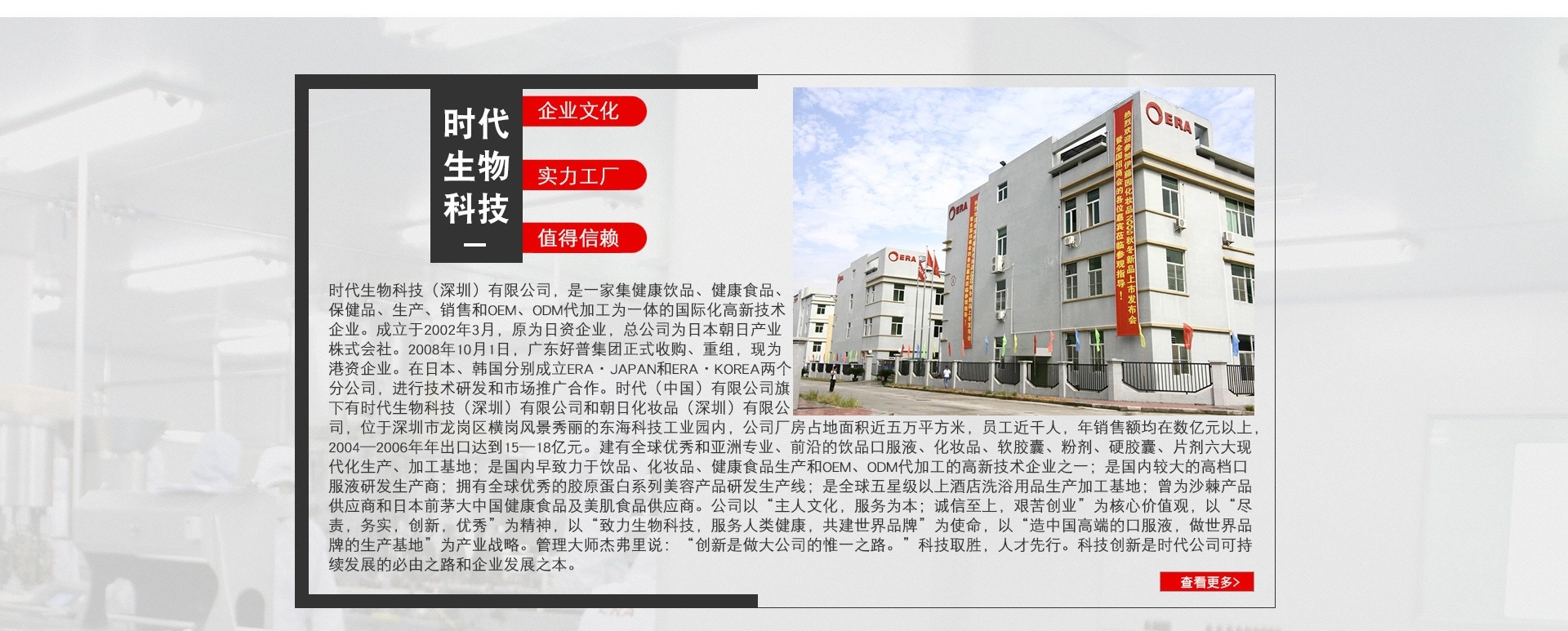 时代(中国)集团是一家以健康口服液、美容饮品、粉剂固体饮料为主的高端技术研究、产品开发、生产和ODM代加工为一体的国际化高新技术跨国企业集团。时代是国内开创和领衔50ml系列健康口服液、时尚饮品ODM代加工生产的高新技术企业,在国内产能和规模均较大,拥有全球前沿的工艺技术和自动化生产线,胶原蛋白系列产品代加工占据国内市场较大份额。 18年口服液研发及生产经验; 建成3个大型现代化工厂,南北方生产基地合计超8万平米; 拥有中、日、韩等地5个高级研发中心及实验室; 合作客户遍布全球45个国家和地区; 服务品牌1000个以上; 20多项相关发明专利; 1个绿色巨人健康管理培训学院; 国内开创并引领50ml口服液发展潮流; 与国内多所高校展开校企合作。