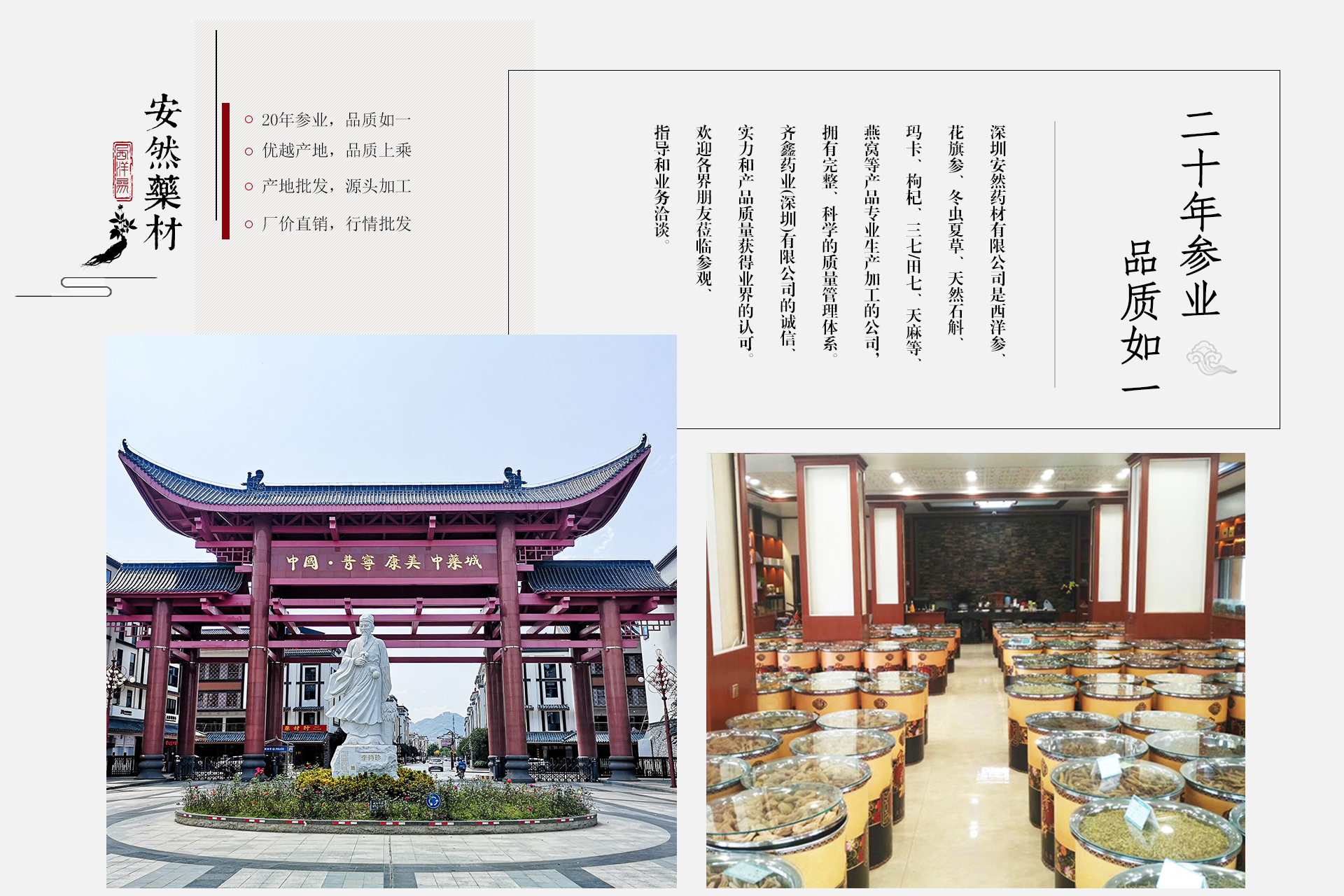 深圳安然药材有限公司是是一家参茸药材、 人参、西洋参、燕窝、冬虫夏草、天然石斜、玛卡、枸杞、三七/田七、鱼胶、雪蛤等贵细滋补品种为一体的集团公司,拥有完整、科学的质量管理体系。深圳安然药材有限公司的诚信、实力和产品质量获得业界的认可。欢迎各界朋友莅临参观、指导和业务洽谈。目前公司已与多家零售商和代理商建立了长期稳定的合作关系,已将公司打造成集种植、研发、生产与销售为一体的全产业链集团化公司,将高品质的滋补品送入千家万户。