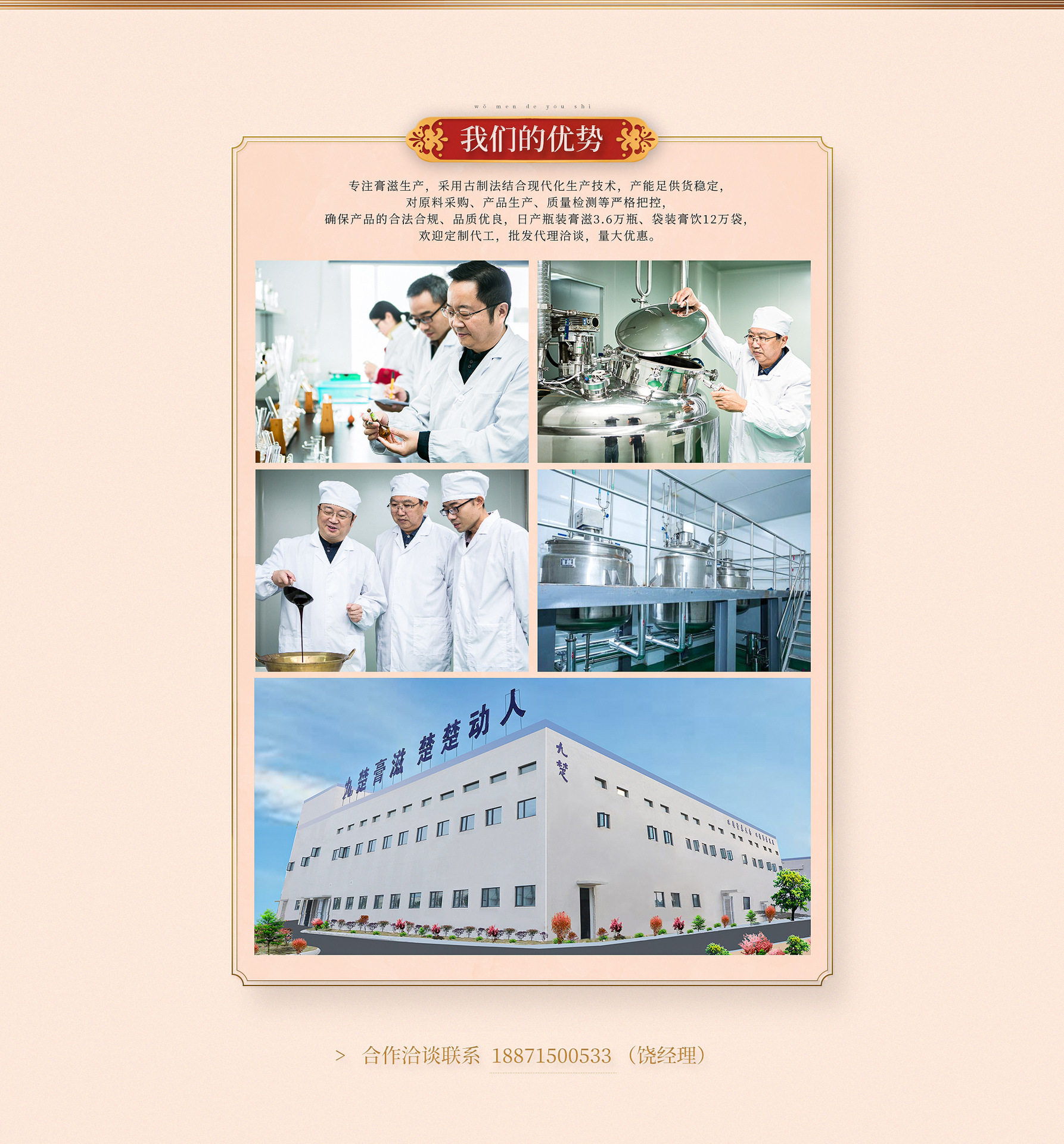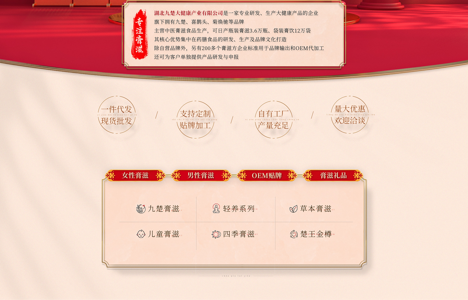 湖北九楚大健康产业有限公司是一家专业研发、生产高端大健康产品的企业,旗下拥有九楚、喜鹊头、菊娭毑等品牌,主营中医膏滋方协定方工厂化生产,可日产瓶装膏滋3.6万瓶、袋装膏饮12万袋;其核心优势集中在药膳食品的研发、生产及品牌文化打造。 公司位于湖北省咸宁市通城经济开发区高新产业园内,除自营品牌外,另有200多个膏滋方企业标准用于品牌输出和OEM代加工,还可为客户单独提供产品研发与申报,可提供产品研发、标准申报、包装设计、品牌和商业策划等服务。