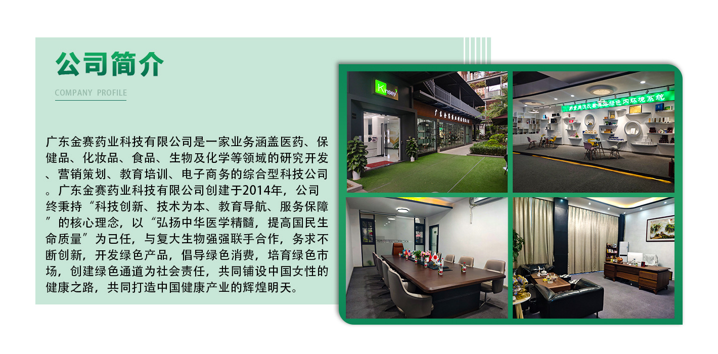 广东金赛药业科技有限公司是一家业务涵盖医药、保健品、化妆品、 食品、生物及化学等领域的研究开发、营销策划、教育培训、电子商务的综合型科技公司。 广东金赛药业科技有限公司创建于2014年,公司终秉持"科技创新、技术为本、教育导航、服务保障"的核心理念,以"弘扬中华医学精髓,提高国民生命质量"为己任,与复大生物强强联手合作,务求不断创新,开发绿色产品,倡导绿色消费,培育绿色市场,建设绿色通道为社会责任,共同铺设中国女性的健康之路,共同打造中国健康产业的辉煌明天。