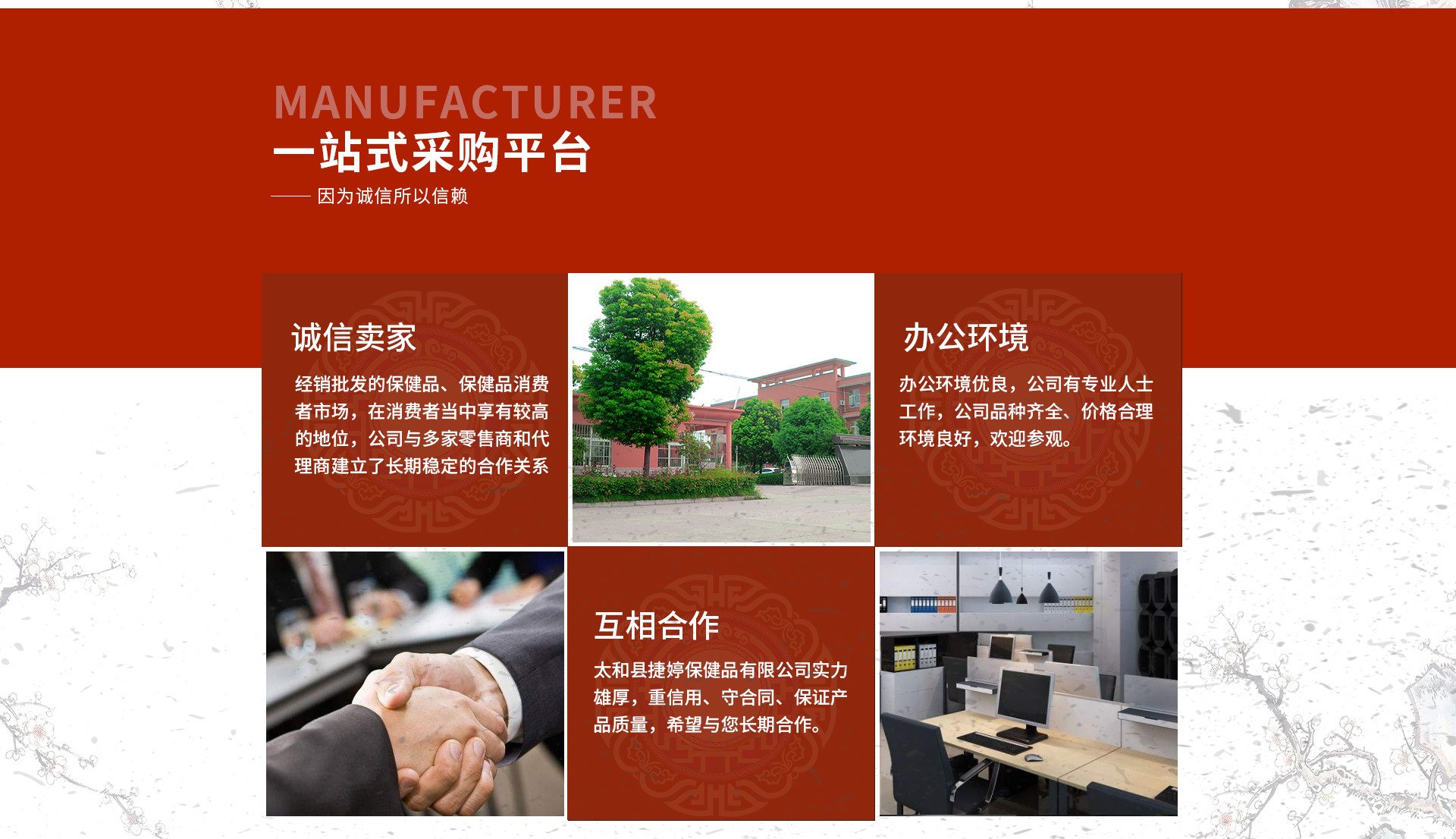 太和县捷婷保健品有限公司 经销批发的保健品、保健品畅销消费者市场,在消费者当中享有较高的地位,公司与多家零售商和代理商建立了长期稳定的合作关系。太和县捷婷保健品有限公司经销的保健品、保健品品种齐全、价格合理。太和县捷婷保健品有限公司实力雄厚,重信用、守合同、保证产品质量,以多品种经营特色和薄利多销的原则,赢得了广大客户的信任。
