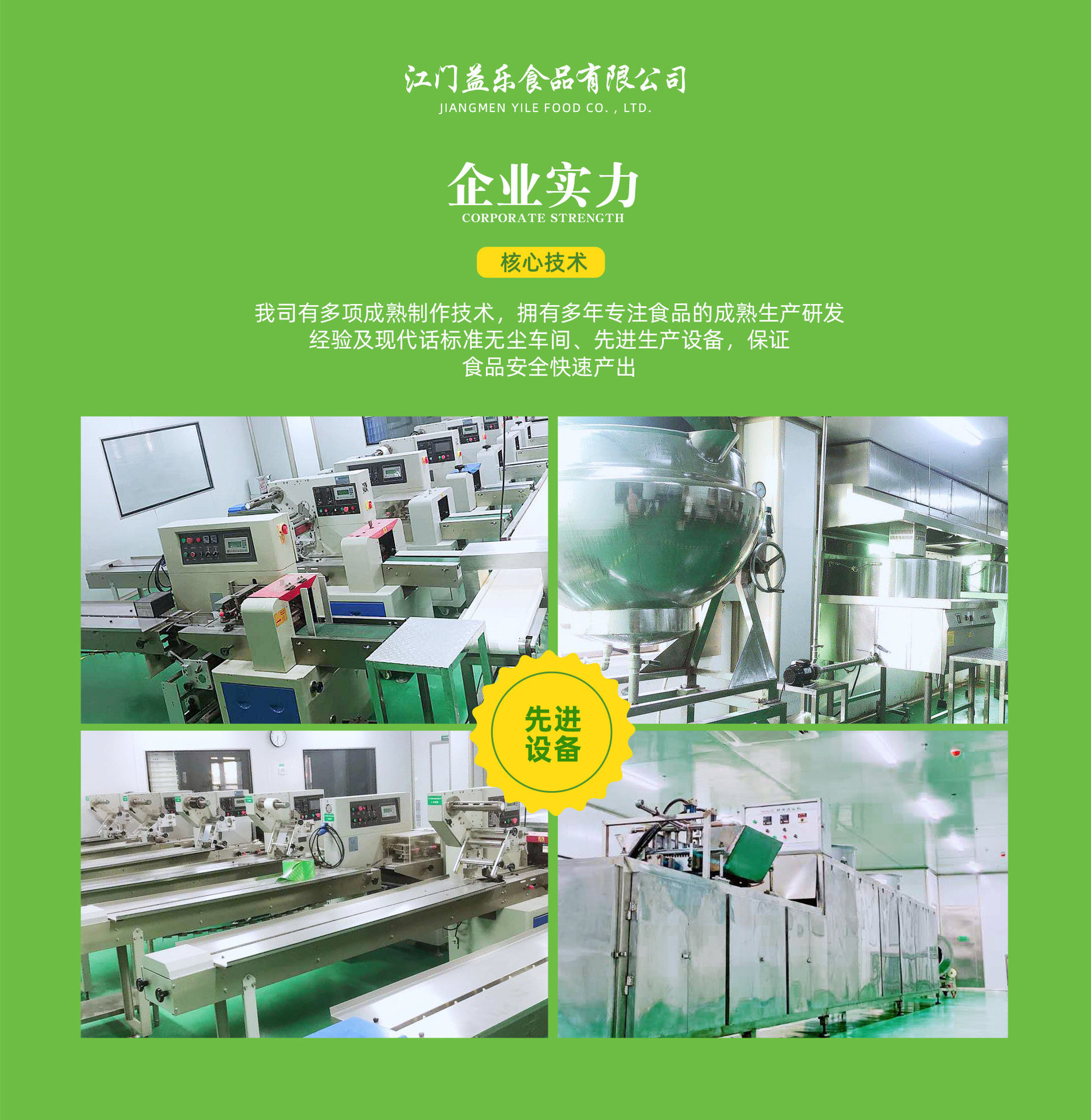 江门市益乐食品有限公司是生产食品、大健康食品、食品包装等产品专业生产加工的公司,拥有十年专业经验,拥有完整、科学的质量管理体系。本公司的诚信、实力和产品质量获得业界的认可。欢迎各界朋友莅临参观、指导和业务洽谈。