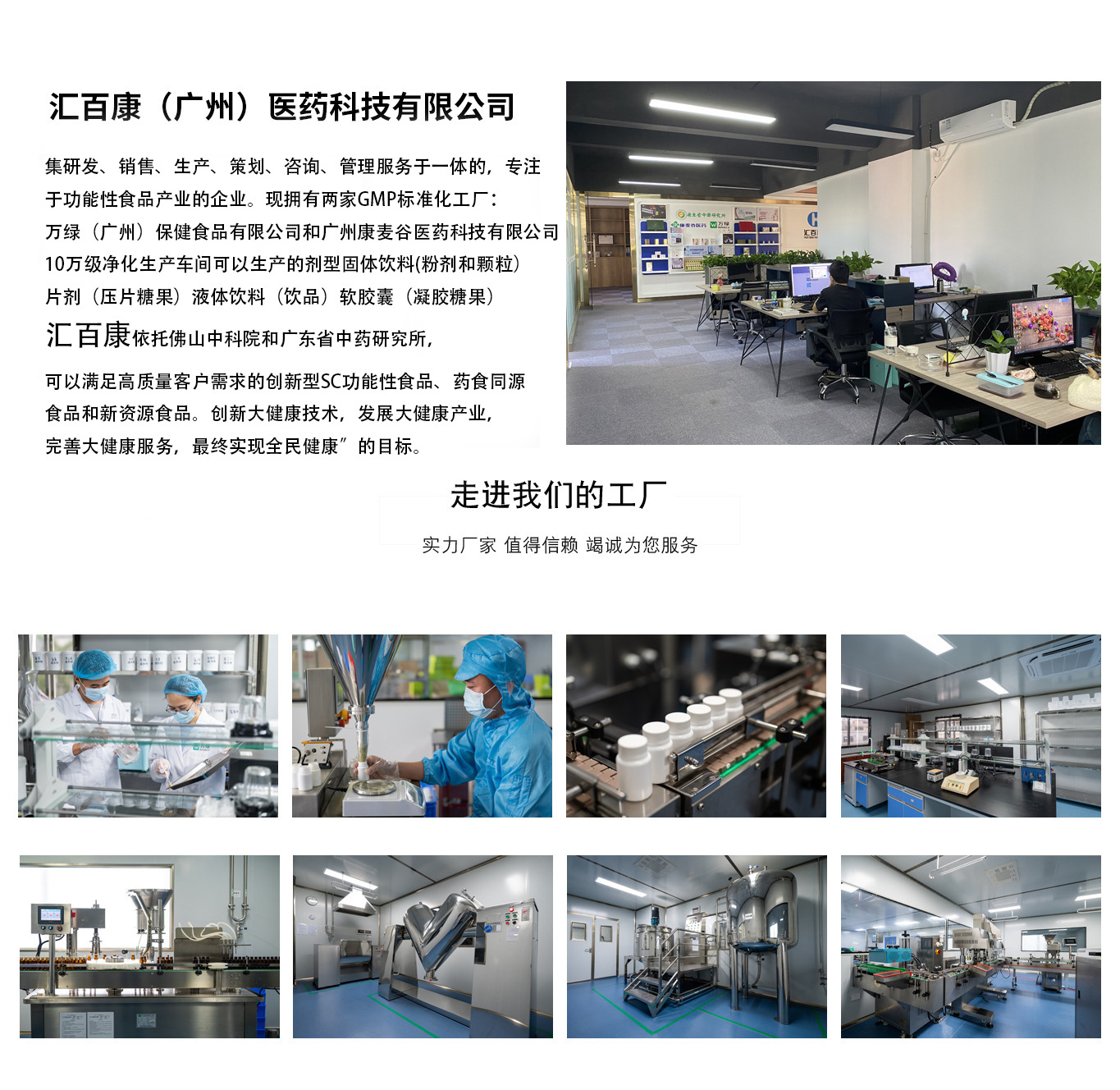 汇百康(广州)医药科技有限公司集研发、销售、生产、策划、咨询、管理服务于一体的,专注于功能性食品产业的企业。现拥有两家GMP标准化工厂:万绿(广州)保健食品有限公司和广州康麦谷医药科技有限公司,10万级净化生产车间可以生产的剂型固体饮料(粉剂和颗粒)片剂(压片糖果)液体饮料(饮品)软胶囊(凝胶糖果) 汇百康依托佛山中科院和广东省中药研究所,可以满足高质量客户需求的创新型SC功能性食品、药食同源食品和新资源食品。创新大健康技术,发展大健康产业,完善大健康服务,最终实现“全民健康”的目标。