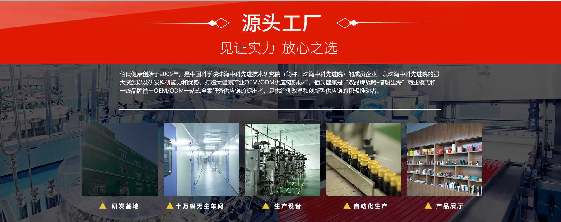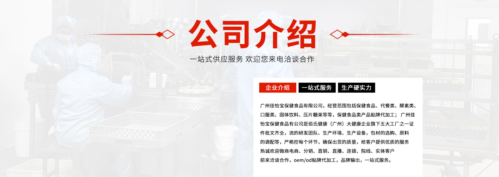 广州佳怡宝保健食品有限公司,经营范围包括保健食品制造;酱油、食醋及类似制品制造;其他调味品、发酵制品制造;糖果、巧克力制造;预包装食品批发;调味品批发;酒类批发;酒类零售等等,保健食品类产品贴牌代加工; 广州佳怡宝保健食品有限公司是佰氏健康(广州)大健康企业旗下五大工厂之一,证件批文齐全,一流的研发团队、生产环境、生产设备,包材的选购、原料的调配等,严格把控每个环节,确保出货的质量,给客户提供优质的服务。 热诚欢迎微商、电商、分销、直销、直播、连锁、院线、实体客户前来洽谈合作,oem/odm贴牌代加工,品牌输出,一站式服务。