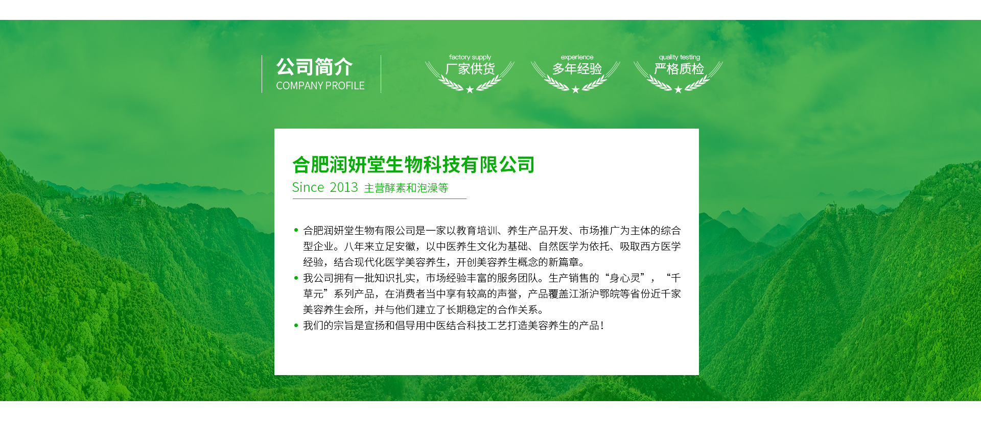 合肥润妍堂生物有限公司是一家以教育培训、养生产品开发、市场推广为主体的综合型企业。八年来立足安徽,以中医养生文化为基础、自然医学为依托、吸取西方医学经验,结合现代化医学美容养生之精髓,开创了美容养生概念的新篇章。 我公司拥有一批知识扎实,市场经验丰富的服务团队。生产销售的“身心灵”,”千草元“系列产品,在消费者当中享有较高的声誉,产品覆盖江浙沪鄂皖等省份近千家美容养生会所,并与他们建立了长期稳定的合作关系。 我们的宗旨是宣扬和倡导用中医精髓结合科技工艺打造美容养生的产品!