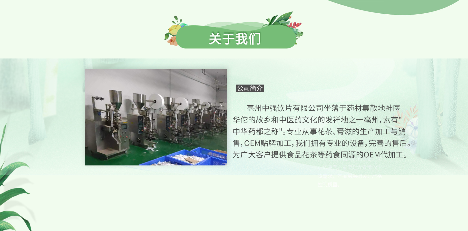 亳州中强中药饮片有限公司是花草茶、花果茶、代泡茶、杂粮、天然粉粉等、花草茶、花果茶、代泡茶、杂粮、天然粉粉等等产品专业生产加工的公司,拥有完整、科学的质量管理体系。亳州中强中药饮片有限公司的诚信、实力和产品质量获得业界的认可。欢迎各界朋友莅临参观、指导和业务洽谈。