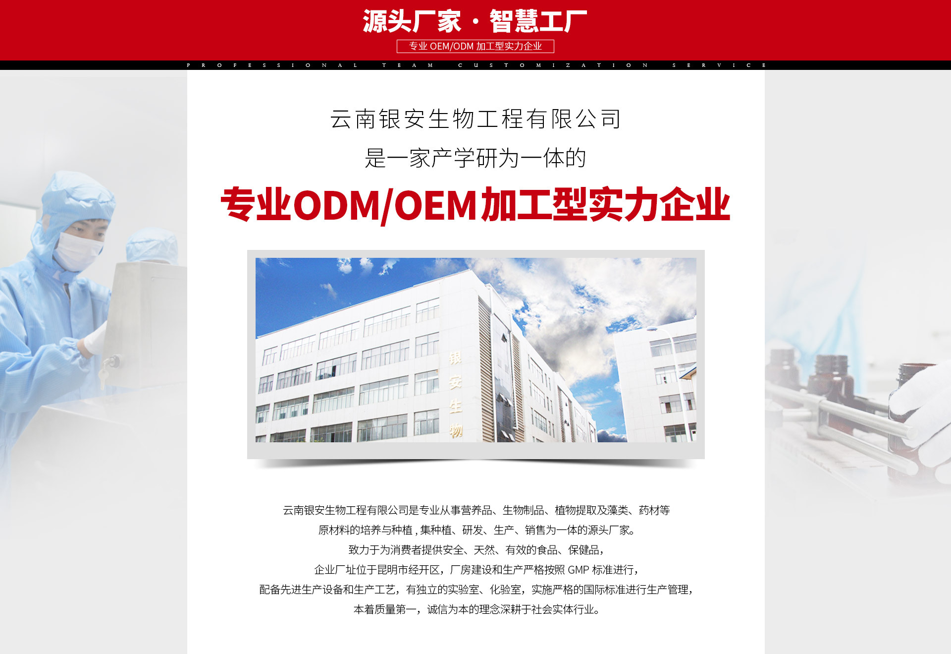 南银安生物工程有限公司是专业从事营养品、生物制品、植物提取及藻类、药材等原材料的培养与种植。集种植、研发、生产、销售为一体的高新技术企业,致力于为消费者提供安全、天然、有效的食品、保健品,为社会食品保健品行业和国家食品安全尽最大的努力并以身作则付诸于行动,企业厂址位于昆明市经济技术开发区,厂房建设和生产严格按照GMP标准进行设计施工,配备先进生产设备和生产工艺,有独立的实验室、化验室,实施严格的国际标准进行生产管理,本着质量第一,诚信为本的理念深耕于社会实体行业。