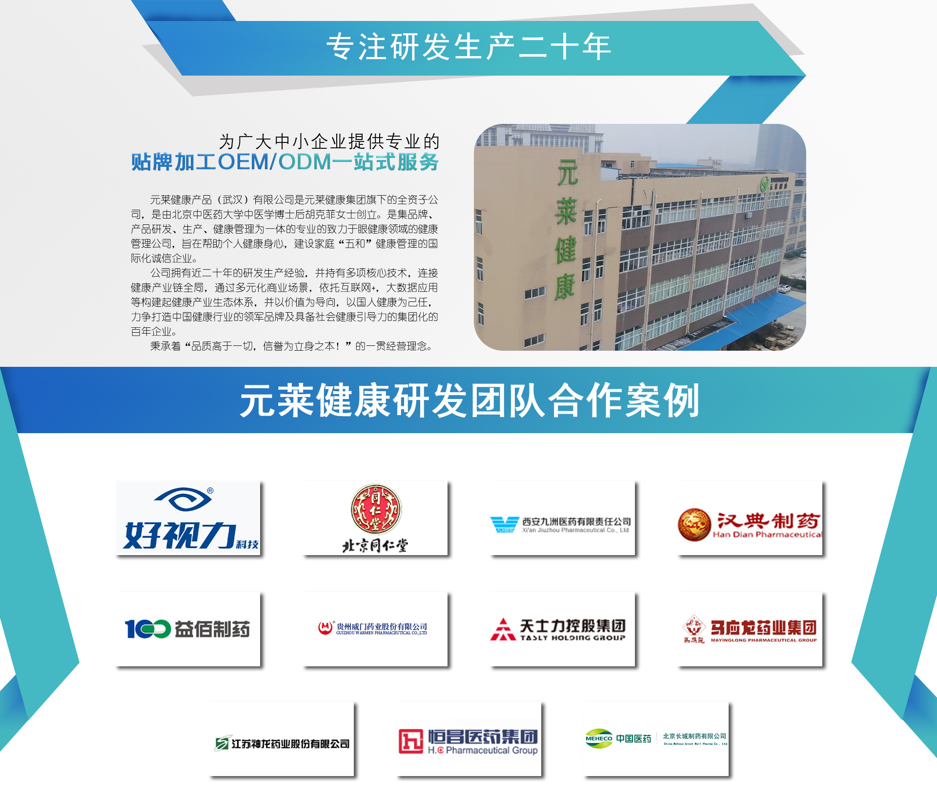 元莱健康产品(武汉)有限公司是由北京中医药大学中医学博士后胡克菲女士创立。是集品牌、产品研发、生产、健康管理为一体的专业的致力于眼健康领域的健康管理公司,旨在帮助个人健康身心,建设家庭“五和”健康管理的国际化诚信企业。 公司拥有近二十年的研发生产经验,并持有多项核心技术,连接健康产业链全局,通过多元化商业场景,依托互联网+,大数据应用等构建起健康产业生态体系,并以价值为导向,以国人健康为己任,力争打造中国健康行业的领军品牌及具备社会健康引导力的集团化的百年企业。 秉承着“品质高于一切,信誉为立身之本!”的一贯经营理念。