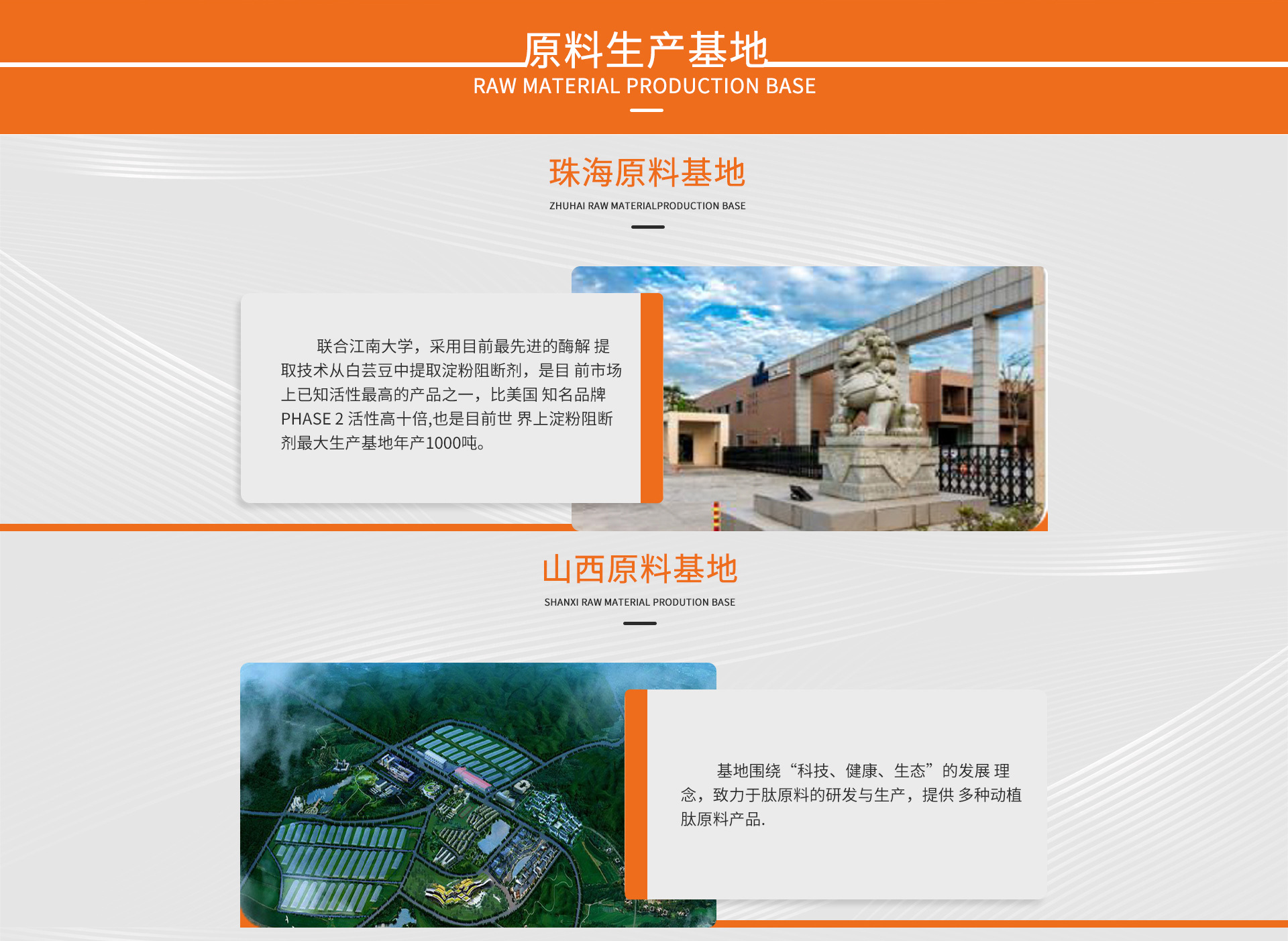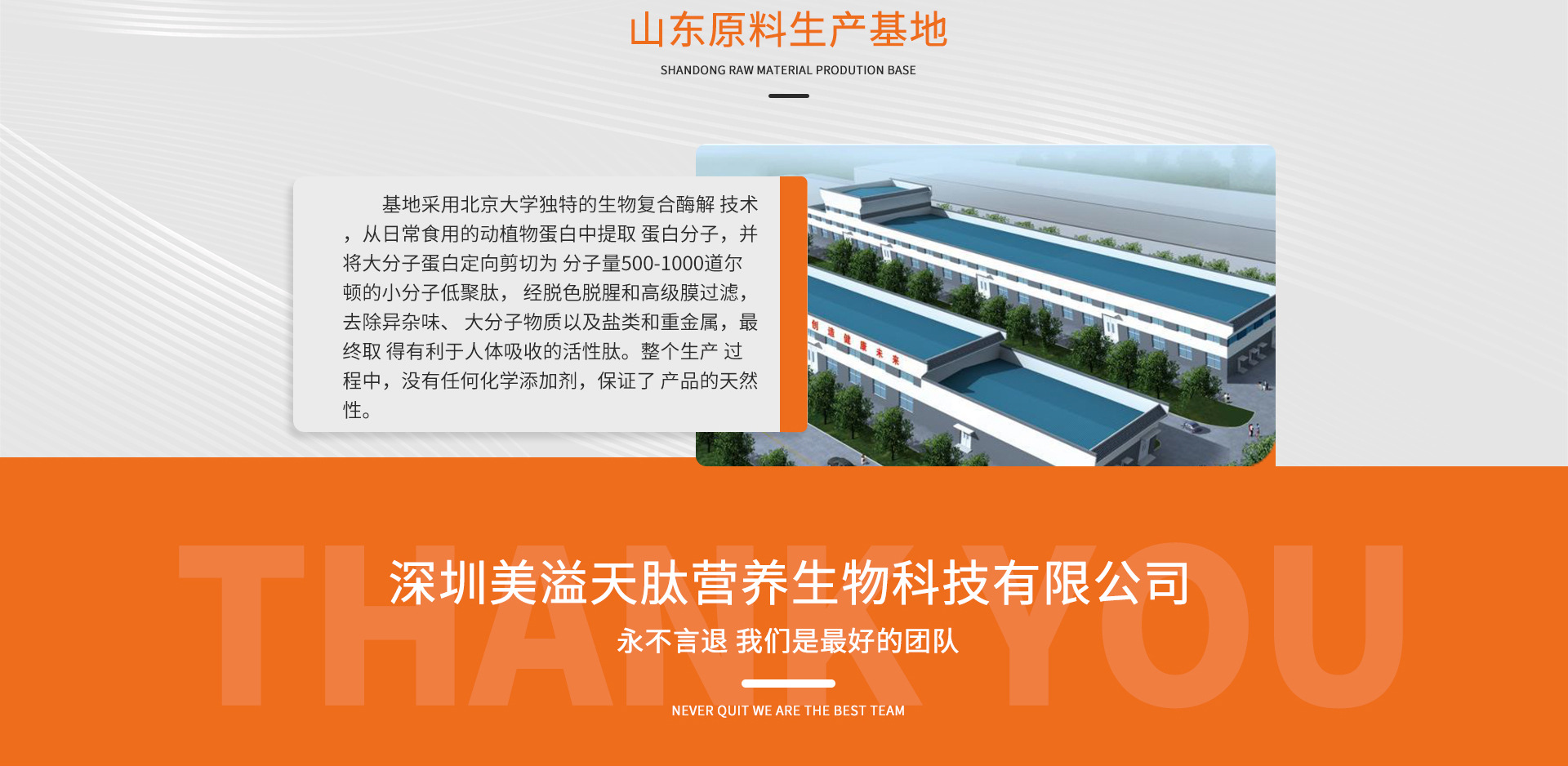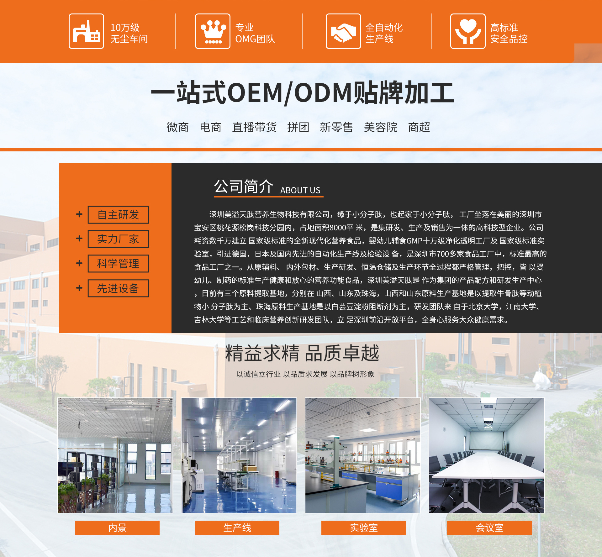 深圳美溢天肽营养生物科技有限公司,缘于小分子肽,也起家于小分子肽, 工厂坐落在美丽的深圳市宝安区桃花源松岗科技分园内,占地面积8000平 米,是集研发、生产及销售为一体的高科技型企业。公司耗资数千万建立 国家级标准的全新现代化营养食品,婴幼儿辅食GMP十万级净化透明工厂及 国家级标准实验室,引进德国,日本及国内先进的自动化生产线及检验设 备,是深圳市700多家食品工厂中,标准最高的食品工厂之一。从原辅料、 内外包材、生产研发、恒温仓储及生产环节全过程都严格管理,把控,皆 以婴幼儿、制药的标准生产健康和放心的营养功能食品,深圳美溢天肽是 作为集团的产品配方和研发生产中心,目前有三个原料提取基地,分别在 山西、山东及珠海,山西和山东原料生产基地是以提取牛骨肽等动植物小 分子肽为主、珠海原料生产基地是以白芸豆淀粉阻断剂为主,研发团队来 自于北京大学,江南大学、吉林大学等工艺和临床营养创新研发团队.