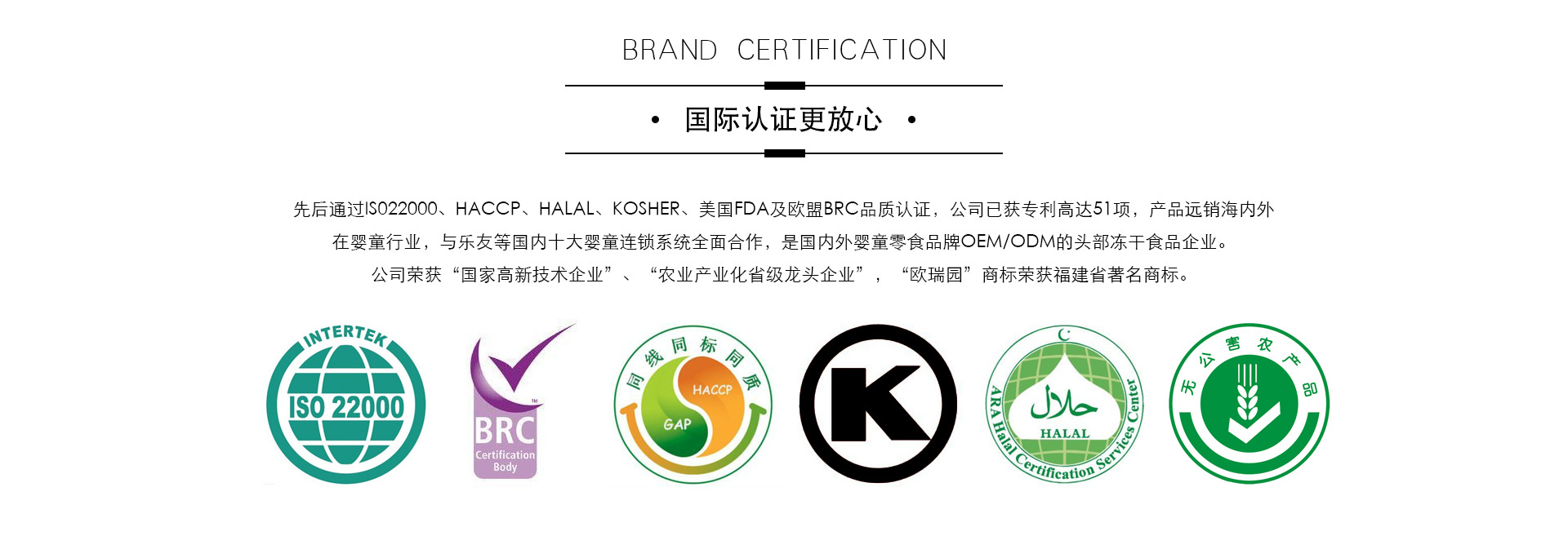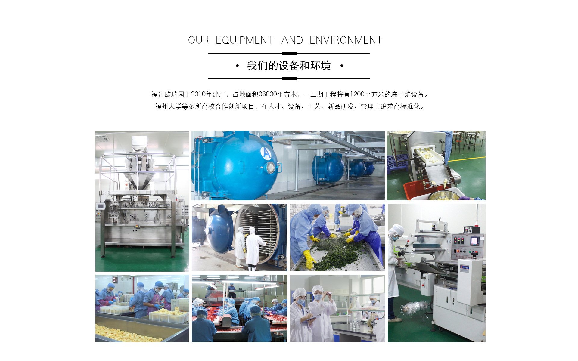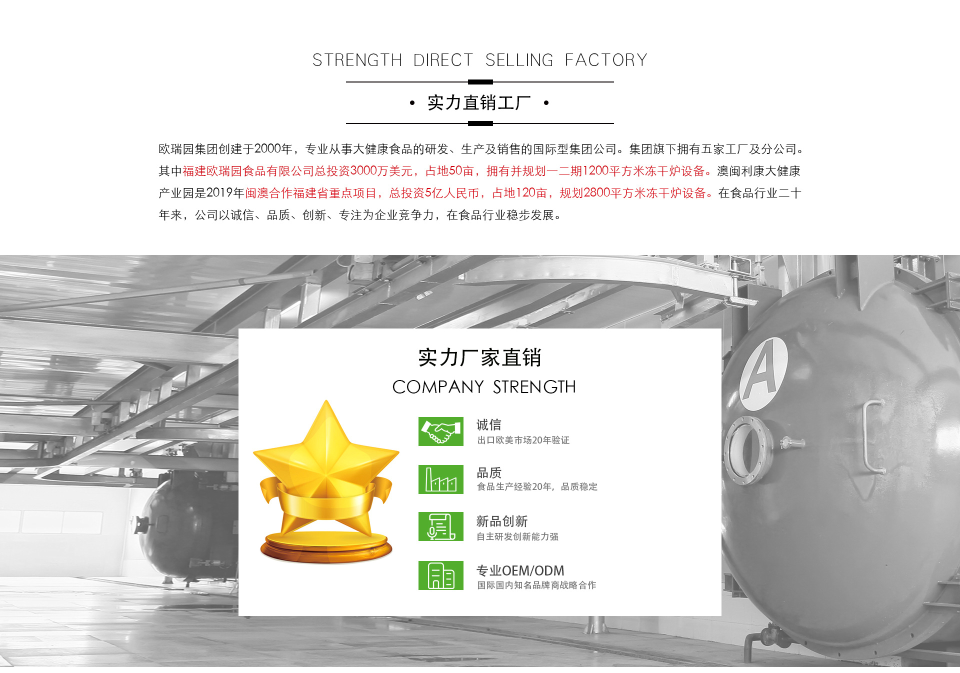 欧瑞园集团创建于2000年,专业从事大健康食品的研发、生产及销售的国际型集团公司。集团旗下拥有五家工厂及分公司。其中福建欧瑞园食品有限公司总投资3000万美元,占地50亩,拥有并规划一二期1600平方米冻干炉设备。澳闽利康大健康产业园是2019年闽澳合作福建省重点项目,总投资5亿人民币,占地120亩,规划3200平方米冻干炉设备。在食品行业二十年来,公司以诚信、品质、创新、专注为企业竞争力,在食品行业稳步发展。