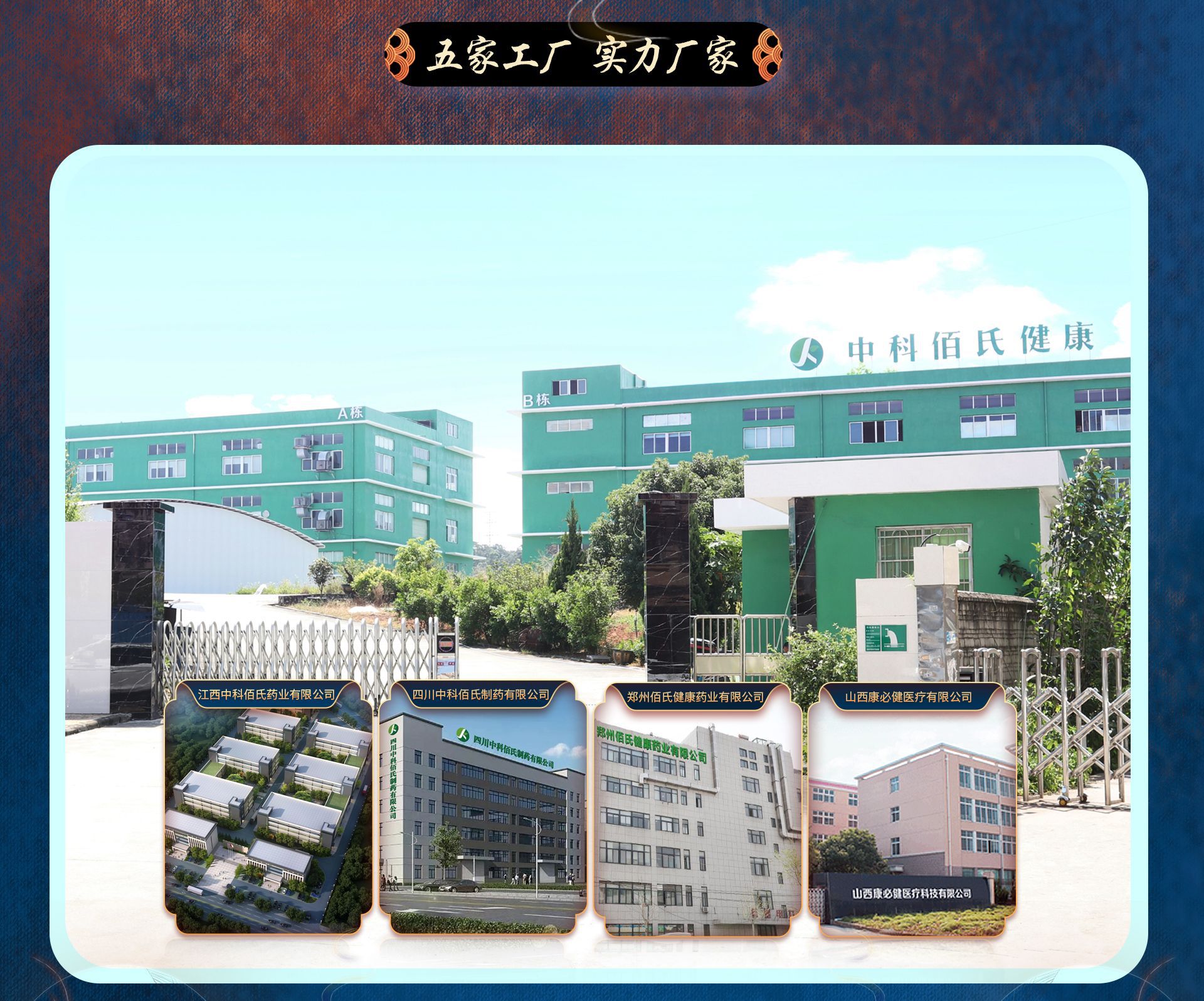 旗下拥有的五大生产基地,包括四川中科佰氏制药有限公司、广州中科佰氏健康产业有限公司、达尔文第(广州)保健食品有限公司、山西康必健医疗科技股份有限公司、广东中科世纪健康科技有限公司,以及自购一百亩地,未来正在搭建的大健康超级工厂:江西中科佰氏药业有限公司。