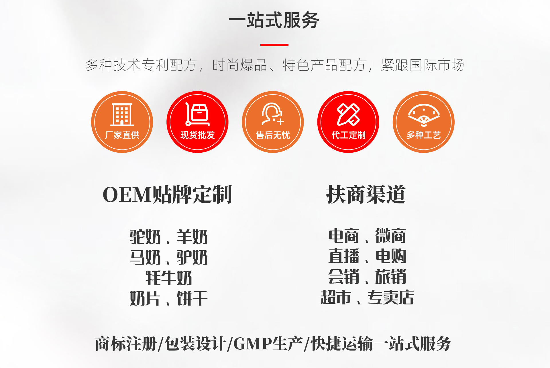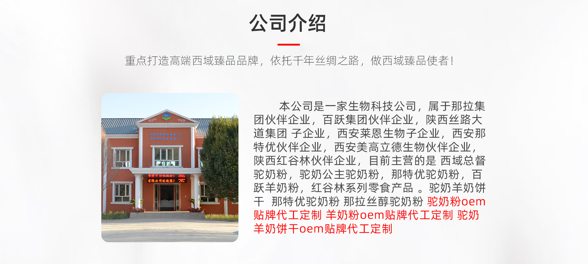 西安丝域臻品生物科技有限公司是一家生物科技公司,属于那拉集团伙伴企业,百跃集团伙伴企业,陕西丝路大道集团 子企业,西安莱恩生物子企业,西安那特优伙伴企业,西安美高立德生物伙伴企业,陕西红谷林伙伴企业,目前主营的是 西域总督驼奶粉,驼奶公主驼奶粉,那特优驼奶粉,百跃羊奶粉,红谷林系列零食产品 。驼奶羊奶饼干 那特优驼奶粉 那拉丝醇驼奶粉 驼奶粉oem贴牌代工定制 羊奶粉oem贴牌代工定制 驼奶羊奶饼干oem贴牌代工定制.