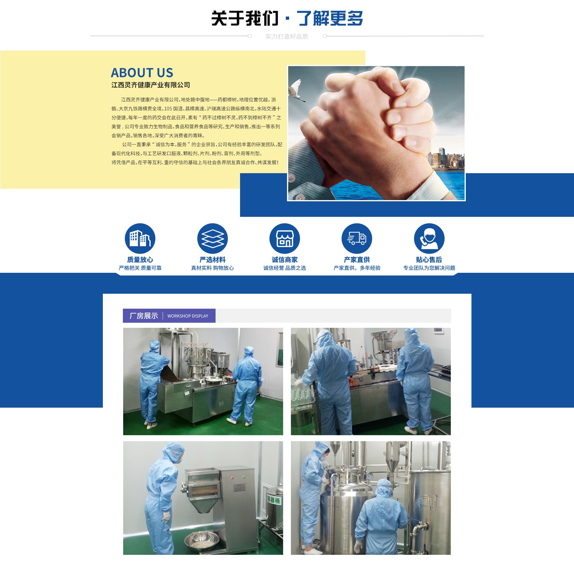 江西灵齐健康产业有限公司,地处赣中腹地——药都樟树,地理位置优越, 浙赣、大京九铁路横贯全境,105国道、昌樟高速、沪瑞高速公路纵横南北,水陆交通十分便捷,每年一度的药交会在此召开,素有“药不过樟树不灵,药不到樟树不齐”之美誉. 公司专业致力生物制品,食品和营养食品等研究、生产和销售,推出一等系列会销产品,销售各地,深受广大消费者的青睐。    公司一直秉承“诚信为本,服务”的企业宗旨,公司有经验丰富的研发团队,配备现代化科技,与工艺研发口服液、颗粒剂、片剂、粉剂、膏剂、外用等剂型。 将凭借产品,在平等互利、重约守信的基础上与社会各界朋友真诚合作、共谋发展!