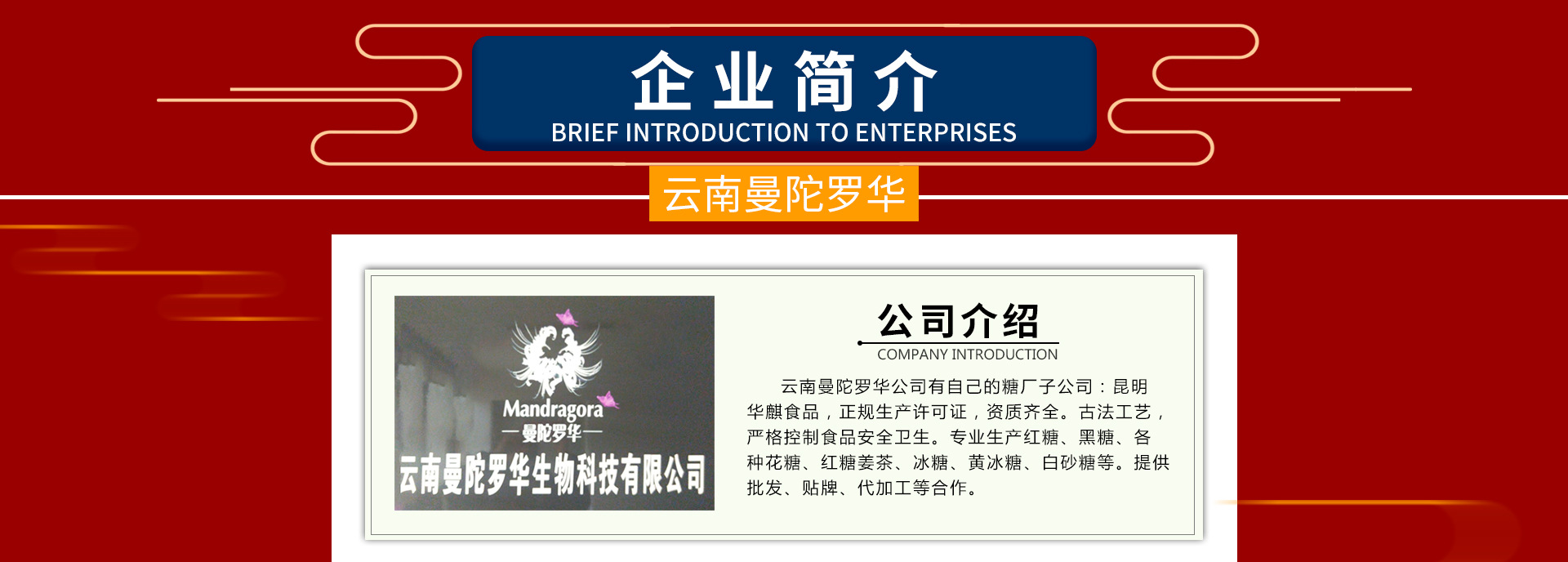 云南曼陀罗华生物科技有限公司致力于红糖、黑糖、固体饮料的批发销售。旗下子公司昆明华麒食品是正规糖厂,有正规齐全的资质,致力于红糖、黑糖、固体饮料的生产包装,可提供OEM贴牌,产品代加工服务。设备齐全,欢迎各界朋友莅临参观、指导和业务洽谈。