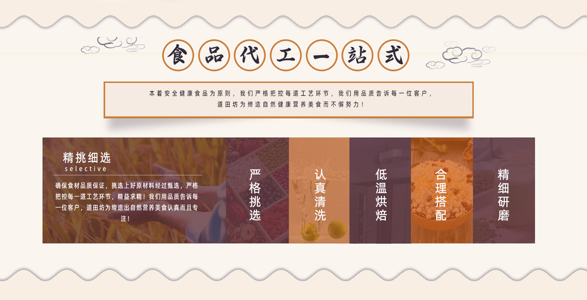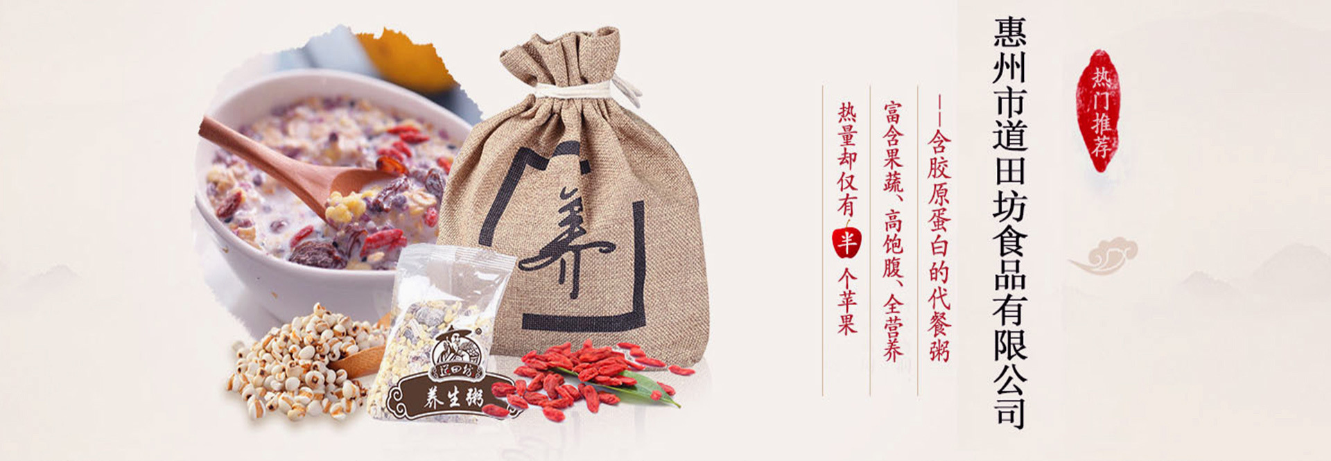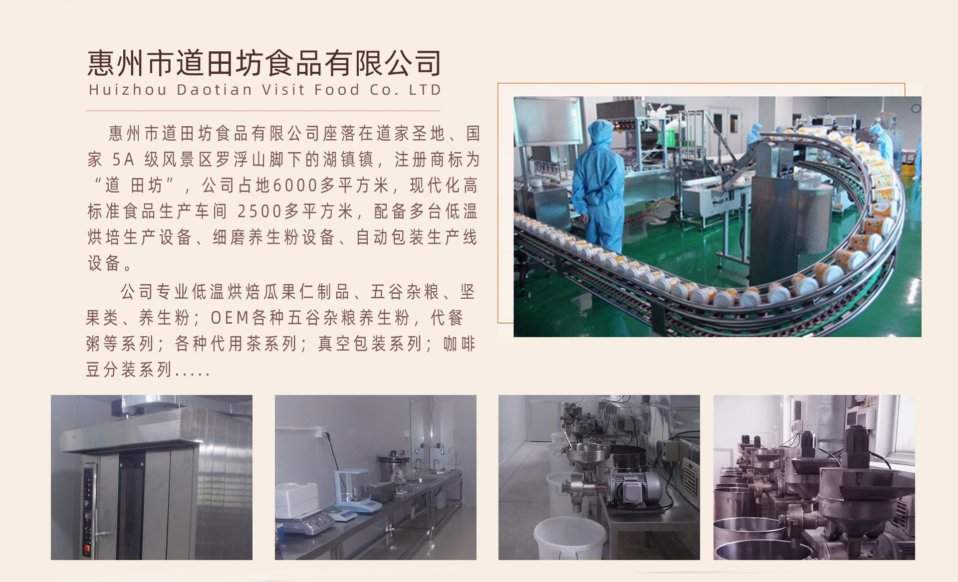 惠州市道田坊食品有限公司座落在道家圣地、国家5A级风景区罗浮山脚下的湖镇镇,注册商标为“道田坊”,公司占地6000多平方米,现代化高标准食品生产车间2500多平方米,配备国内先进低温烘培生产设备、细磨养生粉设备、自动包装生产线设备。公司专业低温烘焙瓜果仁制品、五谷杂粮、坚果类、养生粉、五谷代餐粥系列产品,水果干制品系列产品,咖啡豆分装系列,真空五谷杂粮、五谷八宝粥、五谷十宝米系列产品。公司拥有国内领先低温烘焙技术及生产加工设备,所有原材料的采购均与产地挂钩收购,并进行原材料检测、挑选、清洗、低温烘培、冷却、细磨、成品检验、包装规范生产流程,不添加任何添加剂防腐剂,严格遵从国家食品安全生产许可标准生产,做到每个生产环节严格把控,确保产品安全及营养的保留。 “健康无价,养生有道。”罗浮山作为养生圣地,以其丰富的植物资源、珍贵的水资源和空气资源享誉海内外。