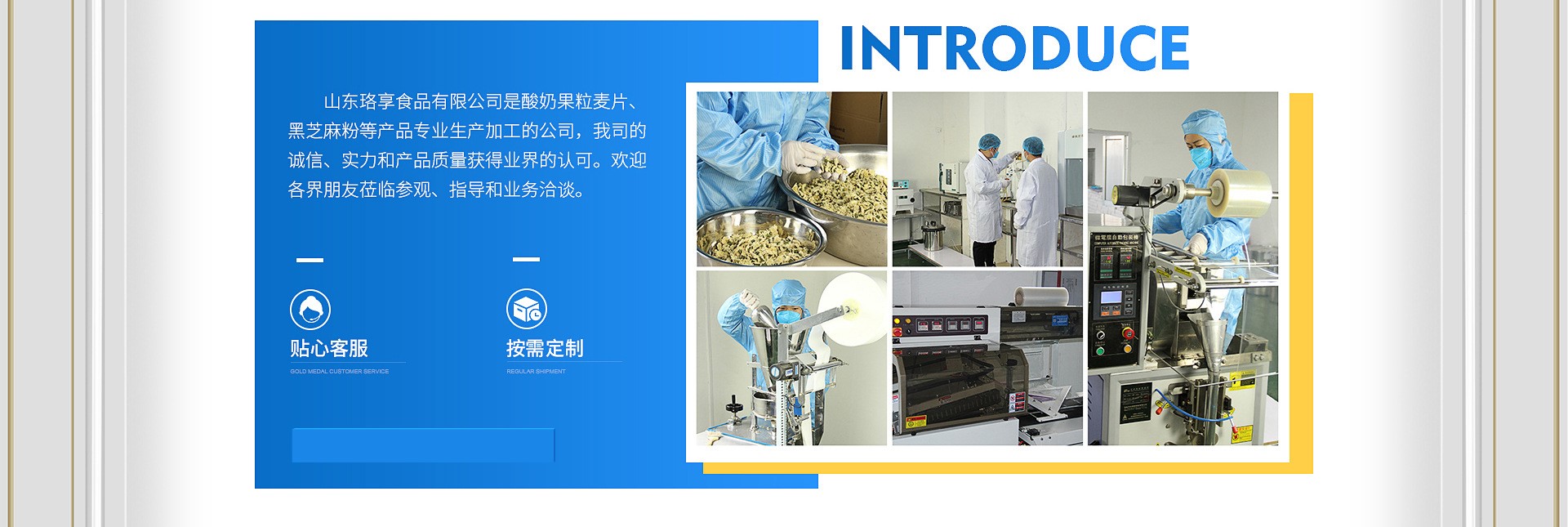 山东珞享食品有限公司是酸奶果粒麦片、黑芝麻粉等产品生产加工的公司,山东珞享食品有限公司的诚信、实力和产品质量获得业界的认可。欢迎各界朋友莅临参观、指导和业务洽谈。