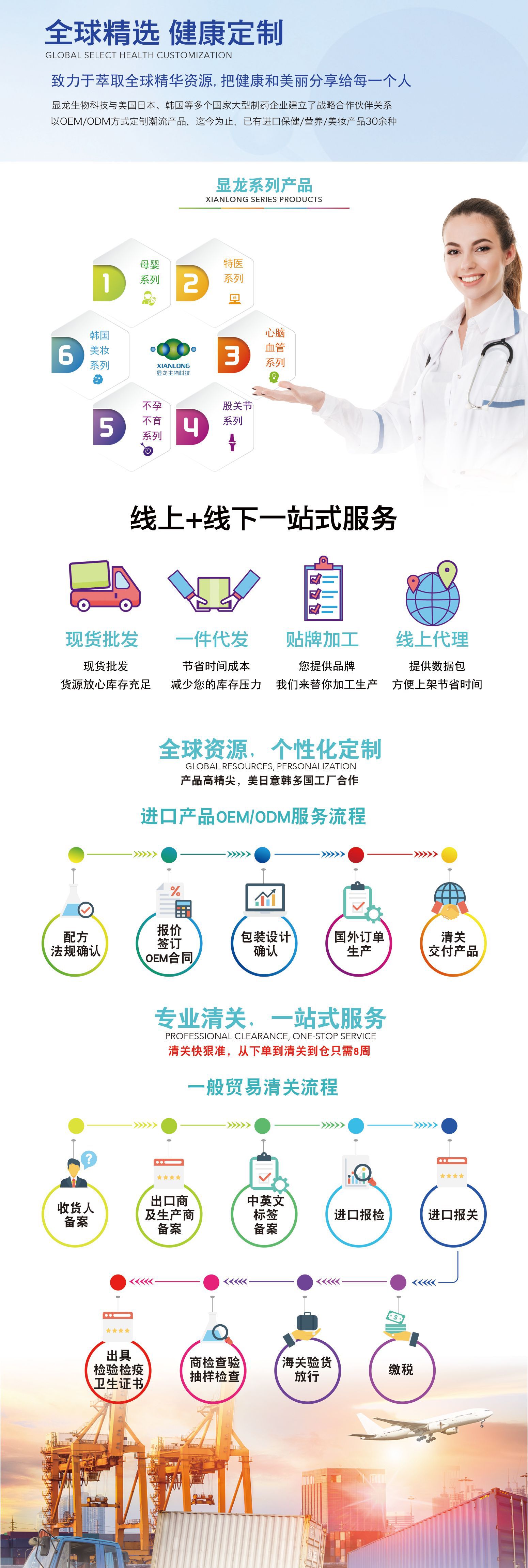 上海显龙生物科技有限公司 经销批发的美国进口保健品辅酶Q10、南极虾青素、南极磷虾油、神经酸、姜黄素、叶黄素、番茄籽油、葡萄籽油、盐藻片等,韩国进口手膜、足膜、颚膜、发膜、染发等畅销消费者市场,在消费者当中享有较高的地位,公司与多家零售商和代理商建立了长期稳定的合作关系。上海显龙生物科技有限公司经销的品种齐全、价格合理可以OEMODM代加工。上海显龙生物科技有限公司实力雄厚,重信用、守合同、保证产品质量,以多品种经营特色和薄利多销的原则,赢得了广大客户的信任