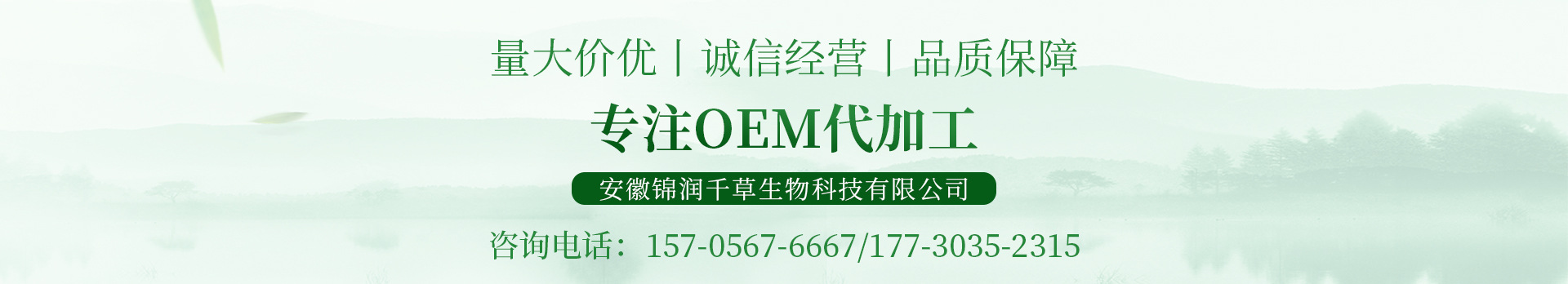 安徽锦润千草生物科技有限公司,占地三千多平方米。员工人数在55人,设备齐全。主要经营:花草茶、花果茶、养生茶、等产品批发及专业OEM贴牌代加工。公司各类证书齐全,质量上乘,价格优惠。有意者可以致电本公司咨询,一切按照客户需求量身定做,出货周期短。OEM贴牌代加工电话:15705676667、17730352315 VX同号 1、 包材:可由客户提供,可由本公司负责印刷与设计。 2、 原料:可由客户指定原料本公司代采购,也可客户直接提 供原料。 3、 规格:袋泡茶每包的净含量可选择3-8克之间。 4、 外包装:建议以铝箔袋、牛皮纸包装或铝箔袋加盒,每包入 数可依客户需求设定。 5、 出货方式:(1)半成品:内袋(裸袋)包装完成出货;(2) 成品:铝袋包、牛皮纸袋、盒装、罐装、装完成出货。