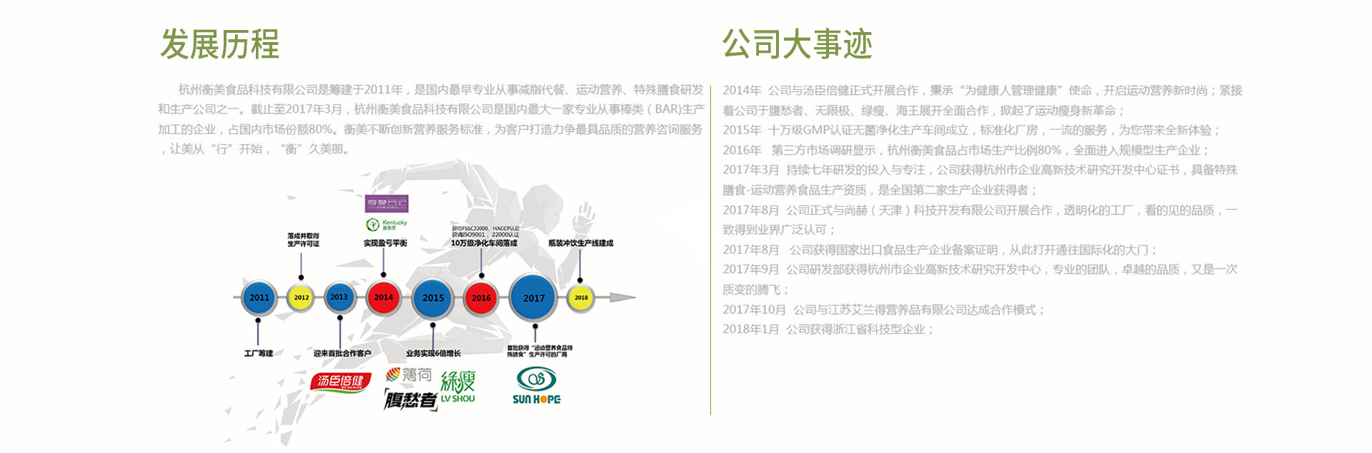 杭州衡美食品科技有限公司筹建于2011年,坐落于美丽的浙江杭州,是一家集研发、生产、销售于一体的科技创新型公司。拥有运动营养食品特殊膳食生产资质。 主要产品包括能量棒、蛋白棒、坚果棒、运动营养棒、以及谷物粉、蛋白粉、奶昔、压片糖果、益生菌、烘焙食品等系列产品。产品应用于体重管理、运动营养、健康零食等领域。 从2014年起公司业绩持续翻番增长,2020年公司营业收入突破5亿元。 公司目前在杭州良渚和安吉有两个生产基地工厂,包括64000平方米的标准化厂房、10000平方米的10万级净化车间,综合仓储10000平方米,拥有数十条现代化生产线,近百台生产设备,建设有营养棒、固体饮料、压片糖果等多个独立现代产品生产车间,获得ISO9001、ISO22000、HACCP、FSSC22000等认证。第三期烘焙厂也已进入投建,致力为客户提供多样化专业OEM/ODM一站式服务。