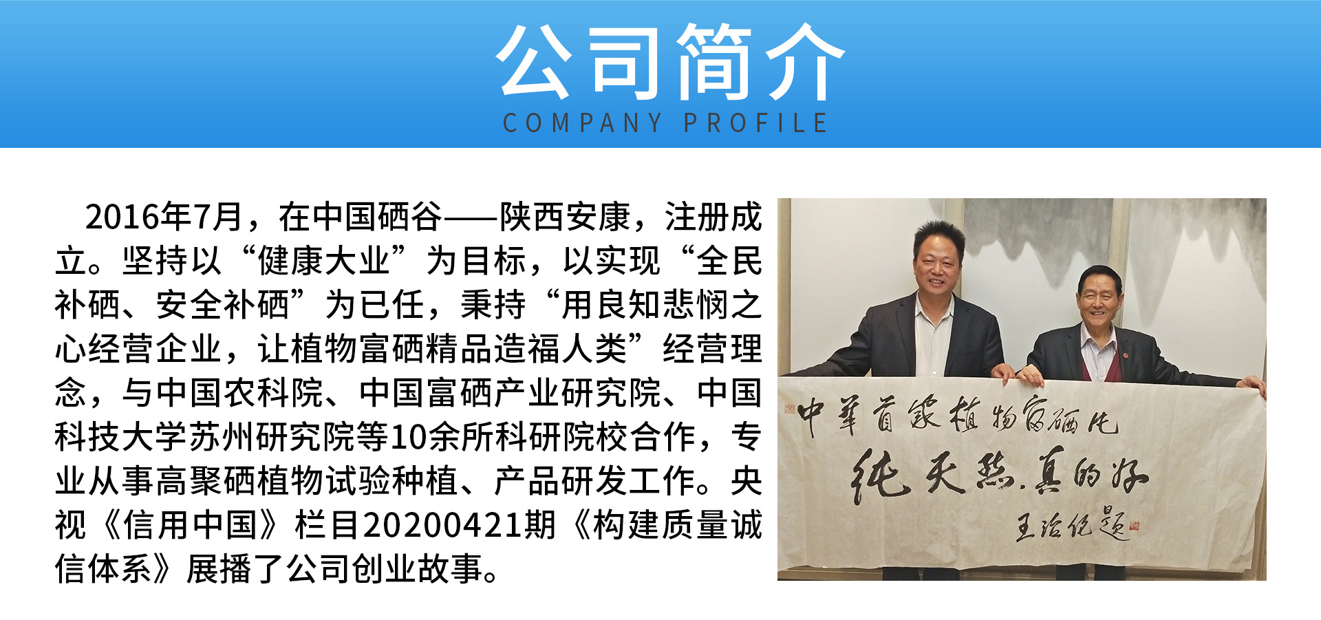 2016年7月8日,陕西安康燚甸园聚硒植物科技开发有限公司,在中国硒谷——陕西安康注册成立,注册资金1688万元,经营范围:聚硒植物技术引进、种植加工,专用肥生产、销售;聚硒植物科技研究、产品研发、推广、销售。  我公司将以”健康大业”为目标,以实现”全民补硒、安全补硒”为已任,秉持” 用良知悲悯之心经营企业,让植物富硒精品造福人类”经营理念,继续扩大对外合作,深入开展技术研究,做精做优富硒产业,大力发展高硒健康产品,使其走向全国、走向世界,努力为人类健康做出应有贡献。