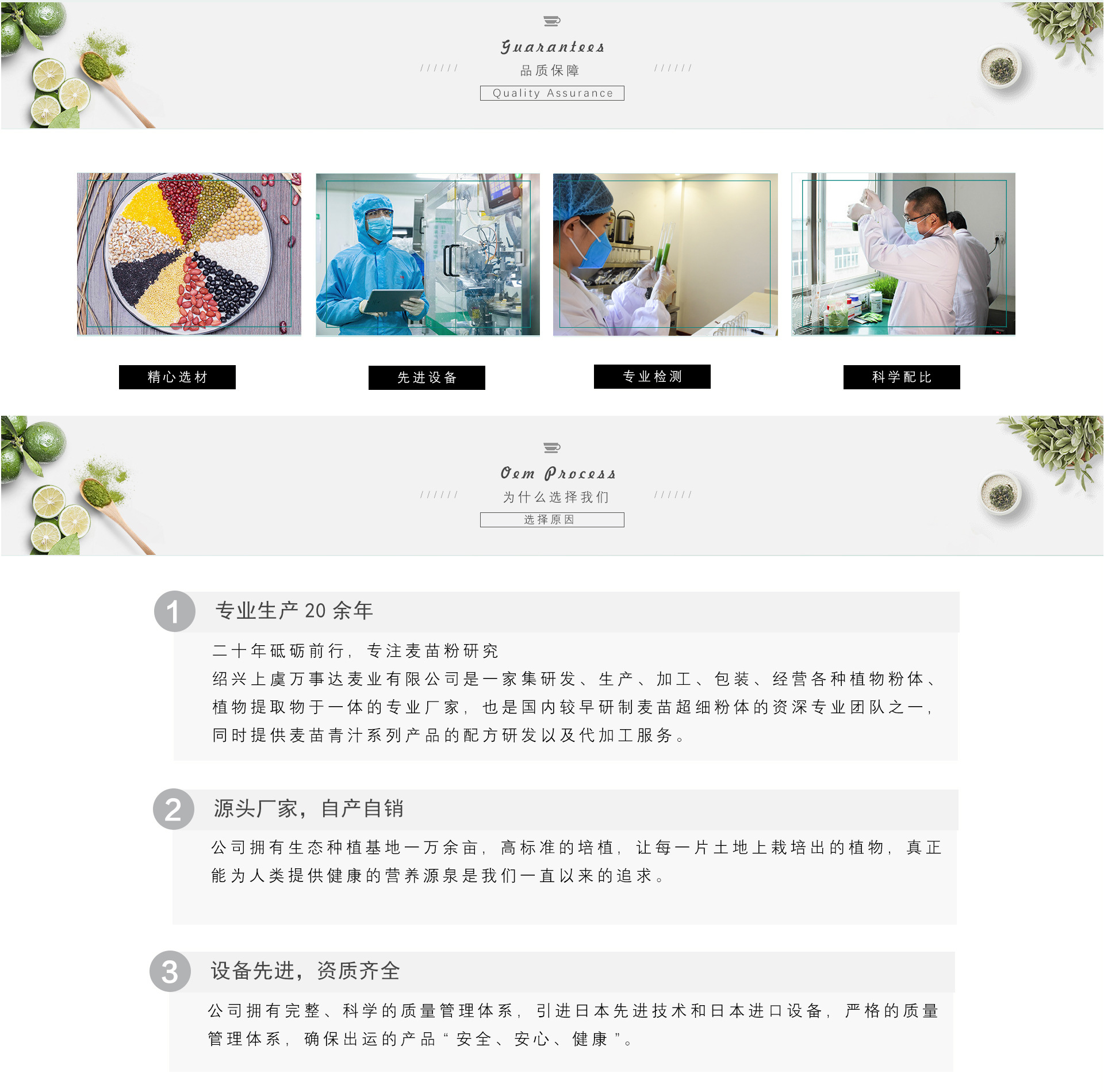 绍兴上虞万事达麦业有限公司(原上虞市万事达麦业有限公司)创建于1998年,公司旗下投资有绍兴市上虞区恒露食用农产品有限公司、绍兴百欧食品有限公司、绍兴市思德龙热流道有限公司。万事达麦业是一家集研发、生产、加工、包装、经营各种植物粉 体、植物提取物于一体的专业厂家,也是国内最早研制麦苗超细粉体的资深专业团队之一,同时提供麦苗青汁系列产品的配方研发服 务。公司总部设在浙江绍兴,拥有生态种植基地一万余亩。公司旗下拥有山本汉方,古越虞阁,夏豆三大品牌。 公司拥有完整、科学的质量管理体系,各类先进的生产和检测设备,确保产品“安全、安心、健康”。 公司主要经营保健品原料的粉体、原植物药材粉体、植物提取物、植物粉末精品小包装等四大类一百多种产品。主营产品有:大麦苗粉、小麦苗粉、燕麦苗粉、苜蓿苗粉、抹茶粉、桑叶粉、羽衣甘蓝粉、啤酒酵母粉、甜菜根粉、绿茶粉等及相应提取物,常规规格有60-15000目。
