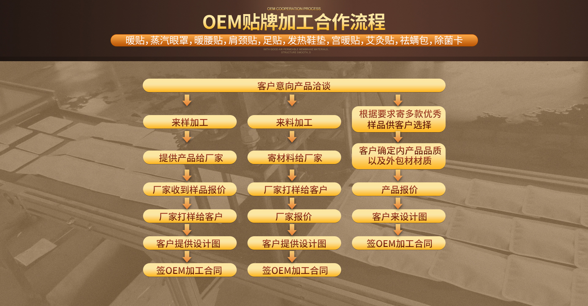 临沂市罗庄区华尚日用品有限公司成立于2013年05月21日,注册地位于罗庄区付庄街道办事处窑北头村,法人代表为鲍婷婷。现有员工500人,其中专业技术人员45人,平均年龄32岁,是一支年轻的创业团队。公司现有办公用地20000平方米、科研用地500平方米、仓库用地3000平方米、生产场地6500平方米,公司是暖贴等产品专业生产加工的公司,拥有完整、科学的质量管理体系。经营范围包括加工、销售:加温袋、活性炭包、发热鞋垫、暖足贴、蒸汽眼罩、暖宝宝、宫暖贴、肩颈贴、暖腰贴、膝盖暖贴、;销售:、日用品、家居用品、无纺布。公司多年致力于产业,切实推进与仁和、修正、南极人、闪亮、雅兰仕、北极绒等各大企业、厂家的合资、合作,用产业化发展的思路服务于社会和广大用户