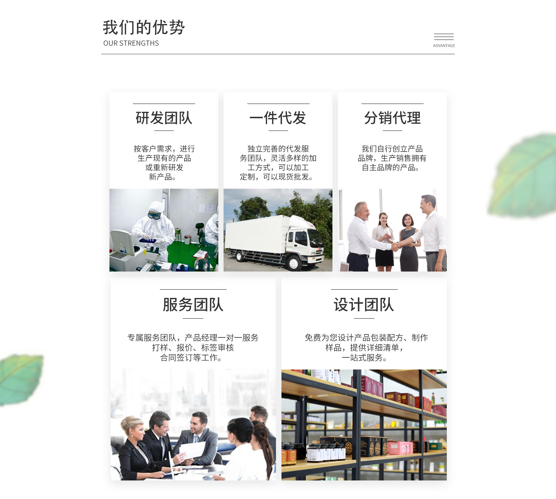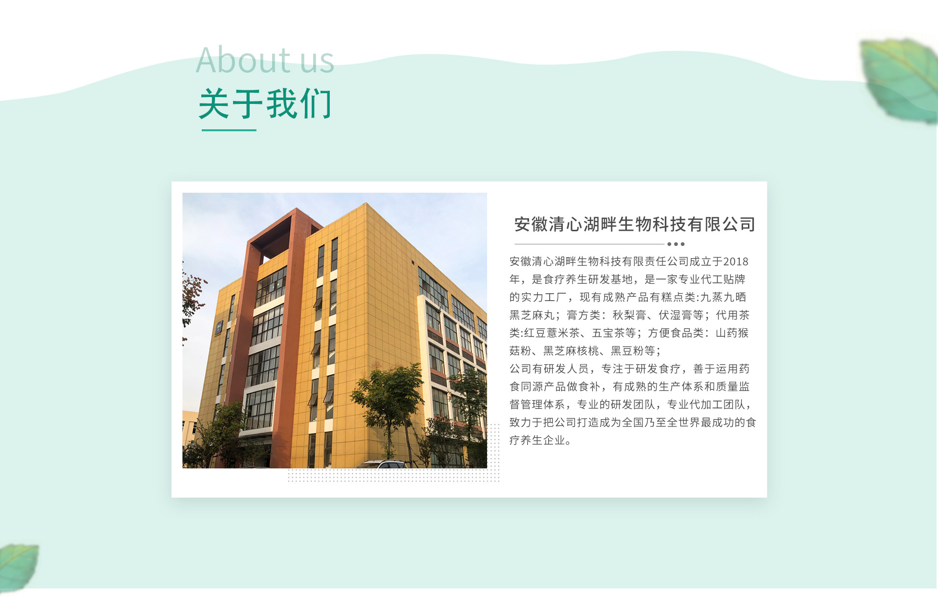 安徽清心湖畔生物科技有限责任公司成立于2018年,是食疗养生研发基地,是一家专业代工贴牌的实力工厂,现有成熟产品有糕点类(九蒸九晒黑芝麻丸、芝麻丸)膏方类(秋梨膏、伏湿膏等),代用茶类(红豆薏米茶 五宝茶等)方便食品类(山药猴菇粉 黑芝麻核桃 黑豆粉等)。 安徽清心湖畔生物科技有限责任公司成立于2018年,是食疗养生研发基地,是一家专业代工贴牌的实力工厂,现有成熟产品有糕点类(九蒸九晒黑芝麻丸、芝麻丸)膏方类(秋梨膏、伏湿膏等),代用茶类(红豆薏米茶 五宝茶等)方便食品类(山药猴菇粉 黑芝麻核桃 黑豆粉等)。 愿景:成为向全世界提供食疗养生代工的全球标杆企业 使命:把安徽清心湖畔生物科技建成为全中国乃至全世界最成功的食疗养生代工厂 目标:成为全世界最优秀的食疗养生品牌服务者