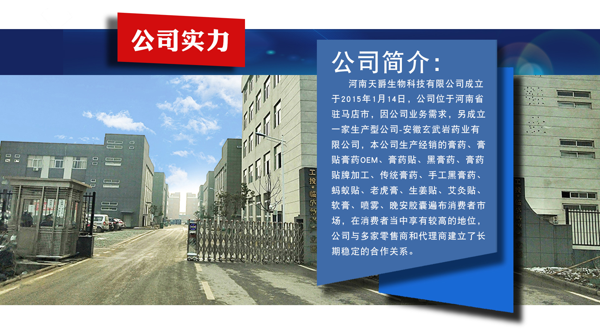 河南天爵生物科技有限公司成立于2015年1月14日,公司位于河南省驻马店市,因公司业务需求,另成立一家生产型公司-安徽玄武岩药业有限公司, 本公司生产经销的膏药、膏贴、膏药OEM、膏药贴、黑膏药、膏药贴牌加工、传统膏药、手工黑膏药、蚂蚁贴、老虎膏、生姜贴、艾灸贴、软膏、喷剂、失眠晚安胶囊畅销消费者市场,在消费者当中享有较高的地位,公司与多家零售商和代理商建立了长期稳定的合作关系。 河南天爵生物科技有限公司经销的膏药、膏贴、膏药OEM、膏药贴、黑膏药、膏药贴牌加工、传统膏药、手工黑膏药、蚂蚁贴、老虎膏、生姜贴、艾灸贴、软膏、喷剂、失眠晚安胶囊品种齐全、价格合理。河南天爵生物科技有限公司和安徽玄武岩药业有限公司实力雄厚,重信用、守合同、保证产品质量,以多品种经营特色和薄利多销的原则,赢得了广大客户的信任。