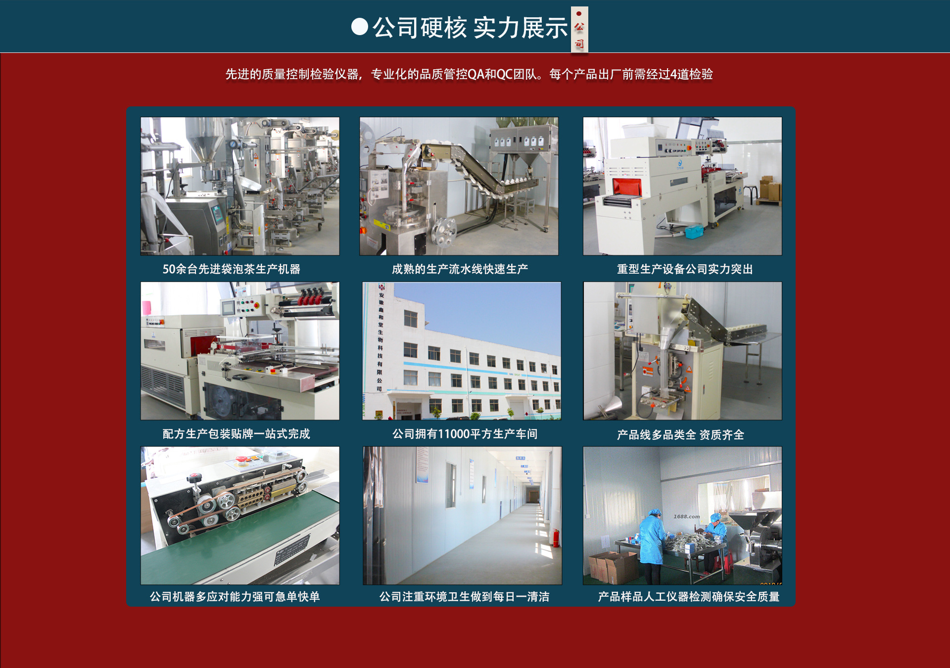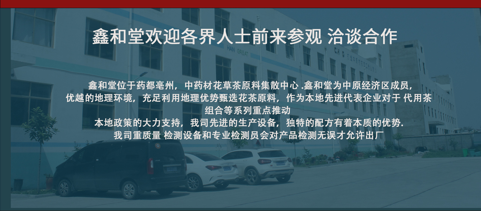安徽鑫和堂生物科技加工产品有:冬瓜荷叶茶,玫瑰荷叶茶,红糖姜茶,贡菊八宝茶、胖大海八宝茶、玫瑰柠檬产、五宝茶、金银花茶、红豆薏仁茶茶、菊花决明子茶、柠檬荷叶茶等袋泡茶,组合茶,单品茶。 公司位于亳州市”长寿之乡,养生之都”,厚重的文化底蕴,完善的产业链,为公司发展提供强劲的资源保障。产品在消费者当中享有较高的地位,与多家零售商和代理商建立了长期稳定的合作关系。鑫和堂生物科技限公司守合同 、重信用、保证产品质量,以多品种经营特色和薄利多销的原则,赢得了广大客户的信任。 公司产业优势:(1)直接与原产地合作。 (2)材料供应量稳定。 (3)成品可以依据要求特定加工 (4) 产品丰富,定位合理——美容、减肥、补肾、睡眠、电脑茶等适合男女老少不同类型的人群,市场覆盖面广泛,需求量大 (5)包装精致、设计新颖-----全新、独特的系列性设计,包装抢眼,安徽鑫和堂生物科技限公司期待与您携手共创美好未来