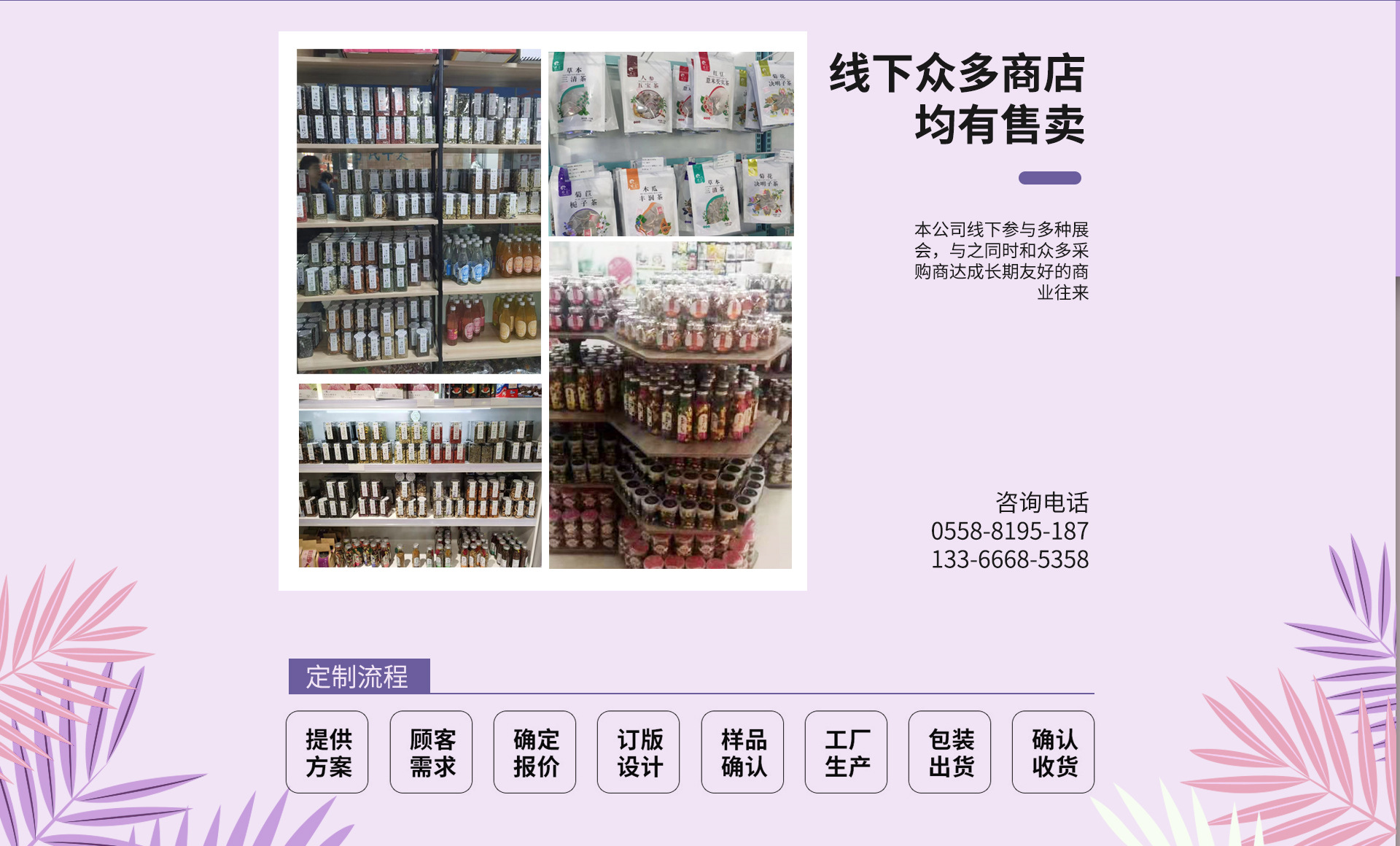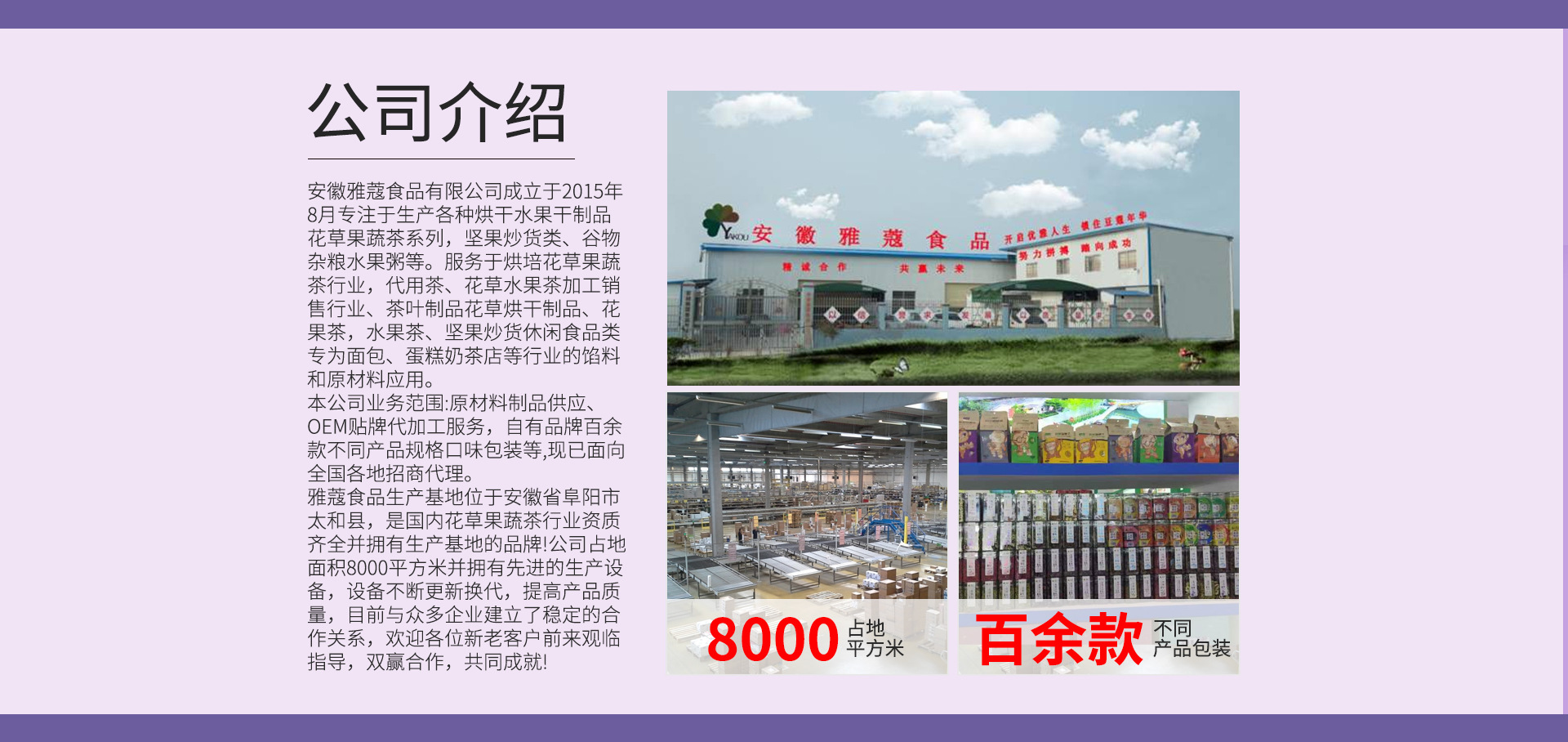 安徽雅蔻食品有限公司 成立于2015年8月 专注于生产各种 烘干水果干制品 花草果蔬茶调味茶系列,烘炒类-坚果 果干 谷物 杂粮水果粥 制品。 服务于烘培,花草果蔬茶行业,代用茶 花草水果茶加工销售行业 茶叶制品 花草烘干制品 花果茶,水果茶 坚果炒货休闲食品类,专为 面包 蛋糕 奶茶店 等行业的馅料和原材料应用。 本公司业务范围:原材料制品供应 OEM 贴牌代加工服务, 自有品牌百余款不同产品规格口味包装等,现已面向全国各地招商代理。 雅蔻食品生产基地位于 安徽省阜阳市 太和县,是国内花草果蔬茶行业 资质齐全并拥有生产基地的品牌!公司占地面积1万平方米 并拥有先进的生产设备,设备不断更新换代 提高产品质量 目前与众多企业建立了稳定的合作关系,欢迎各位新老客户前来观临指导 双赢合作 共同成成!
