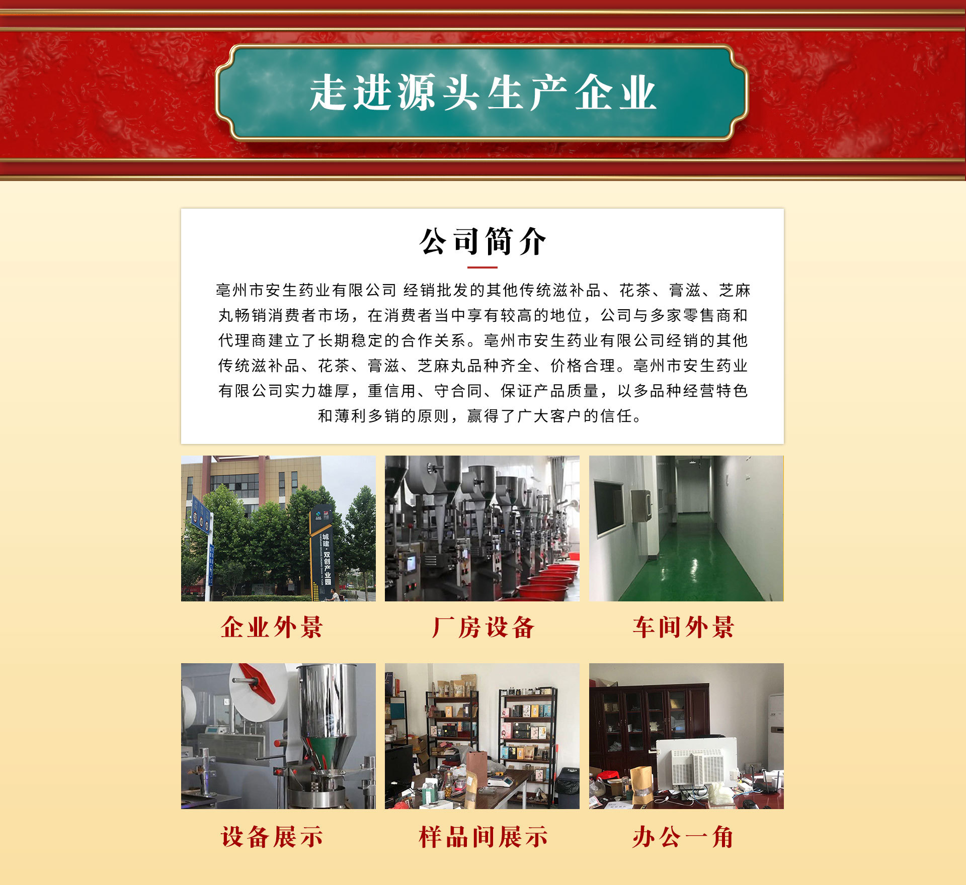 亳州市安生药业有限公司 经销批发的其他传统滋补品、花茶、膏滋、芝麻丸畅销消费者市场,在消费者当中享有较高的地位,公司与多家零售商和代理商建立了长期稳定的合作关系。亳州市安生药业有限公司经销的其他传统滋补品、花茶、膏滋、芝麻丸品种齐全、价格合理。亳州市安生药业有限公司实力雄厚,重信用、守合同、保证产品质量,以多品种经营特色和薄利多销的原则,赢得了广大客户的信任。