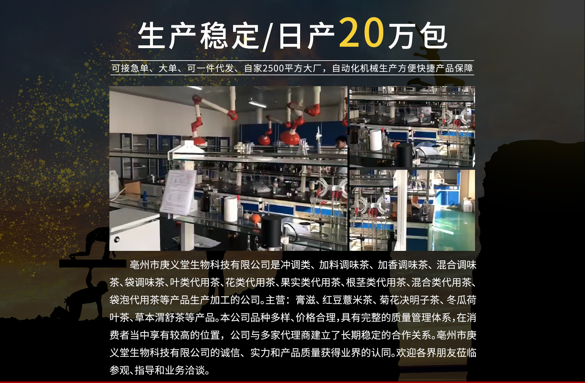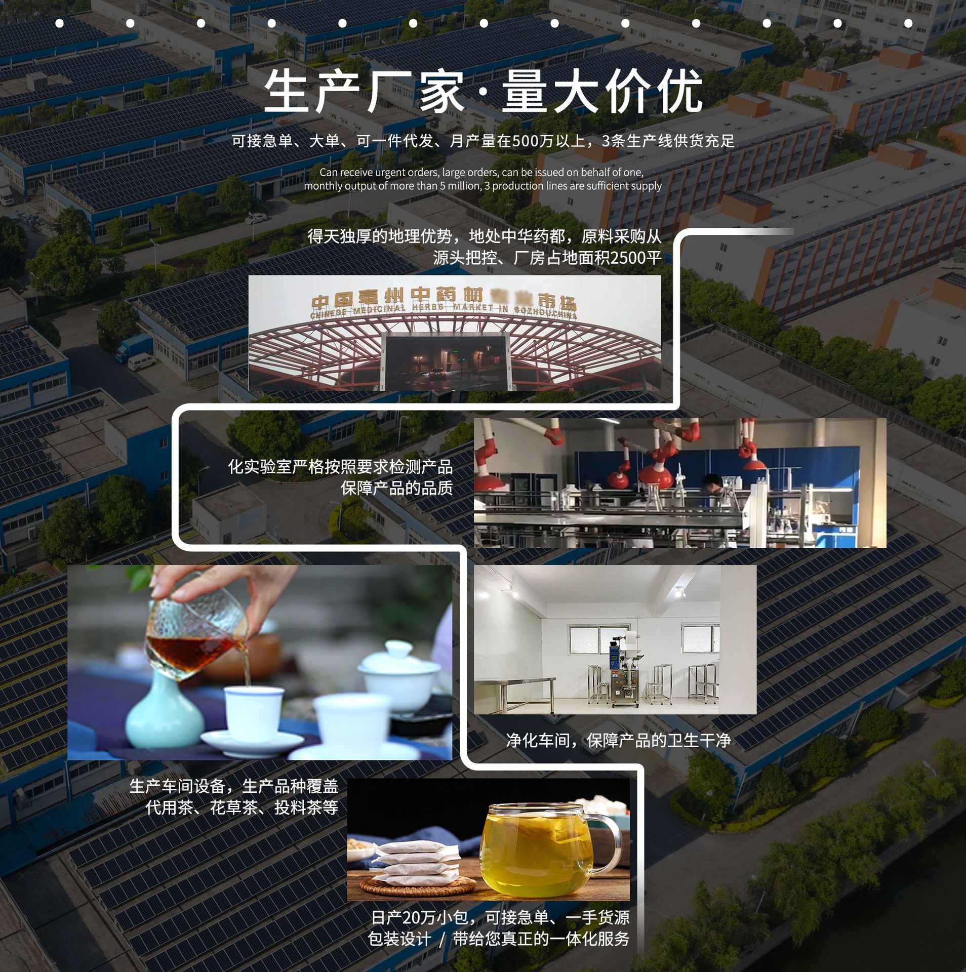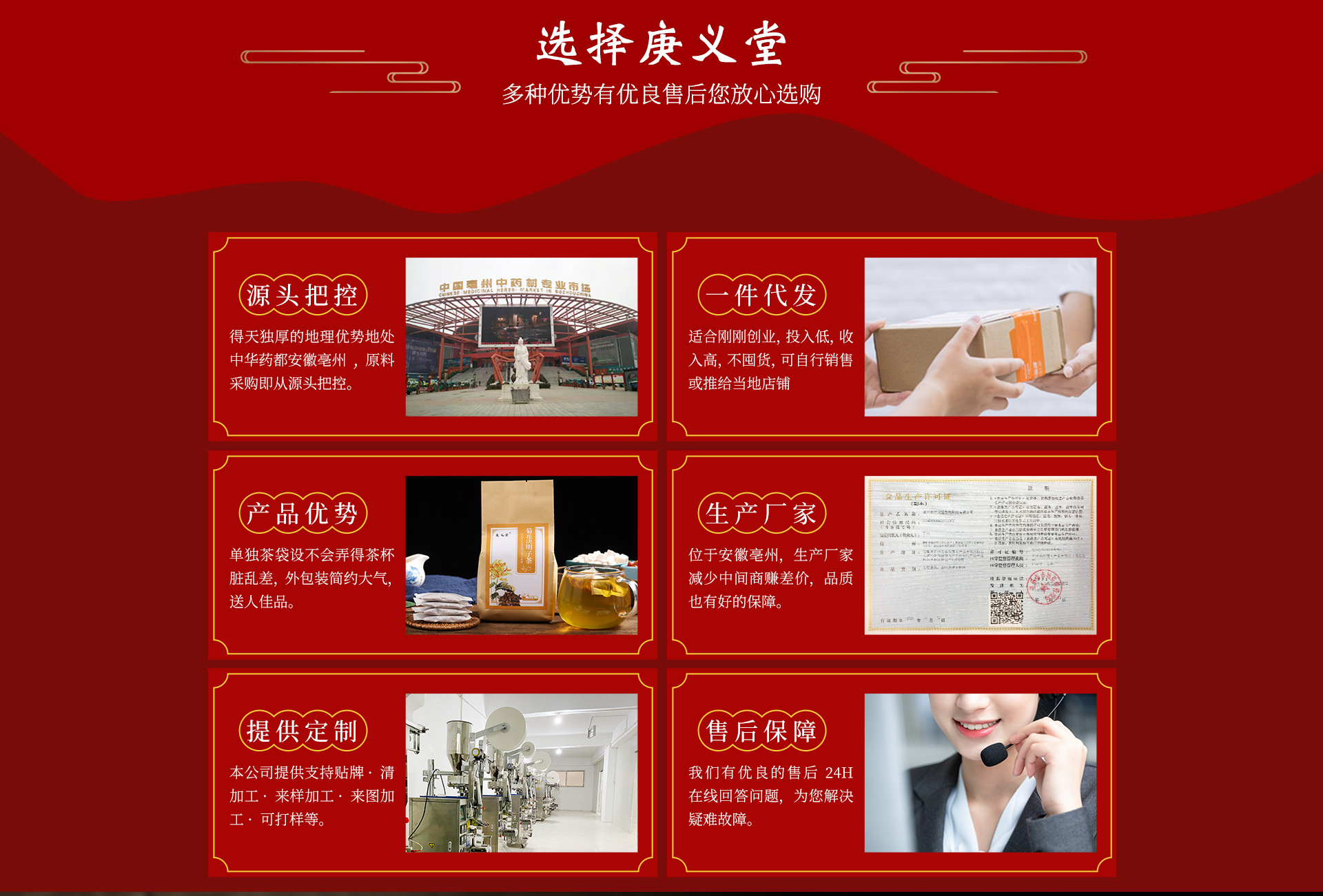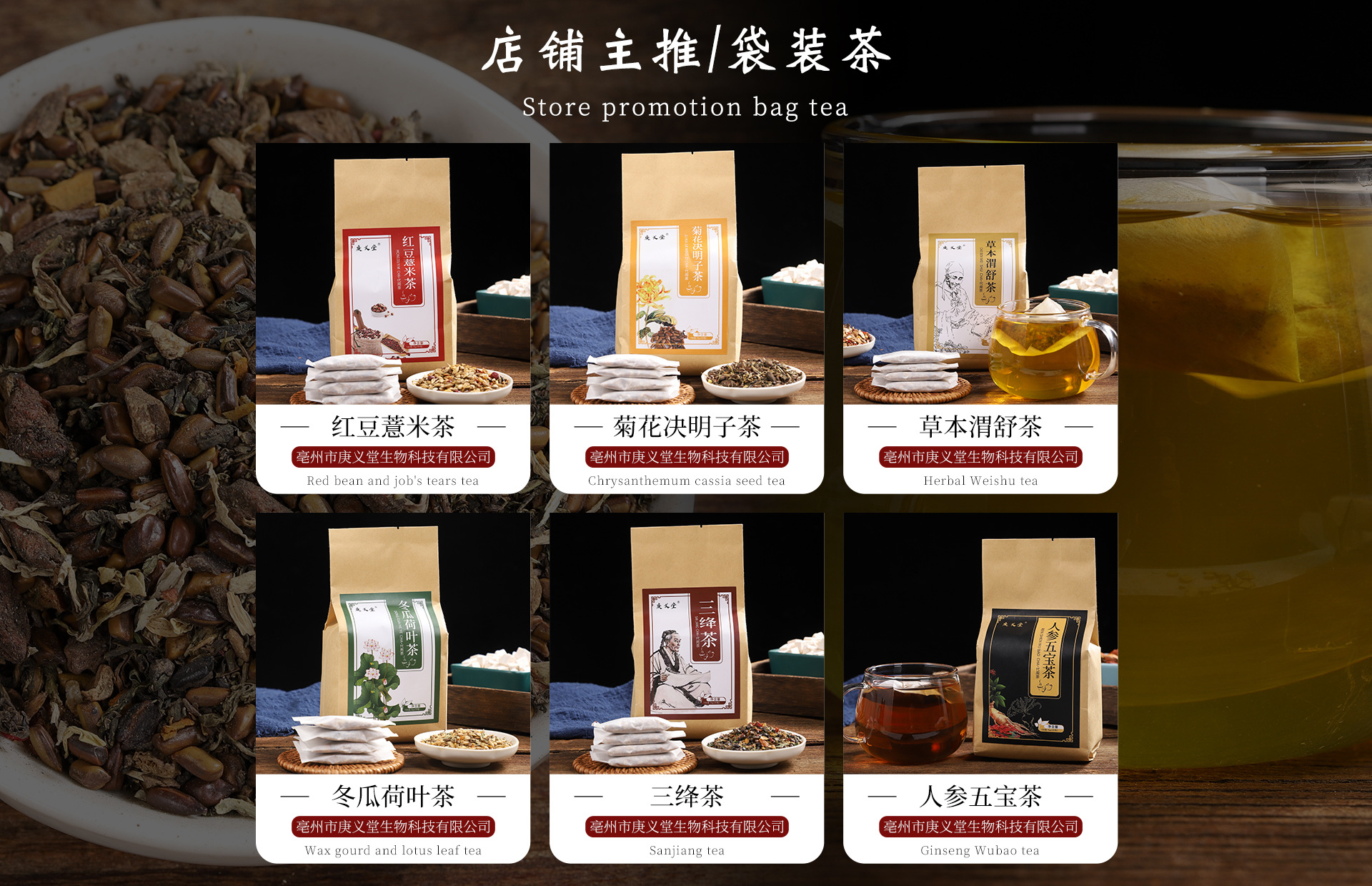 本公司坐落于安徽亳州市,主要经营各种花茶,袋泡茶,膏滋类等