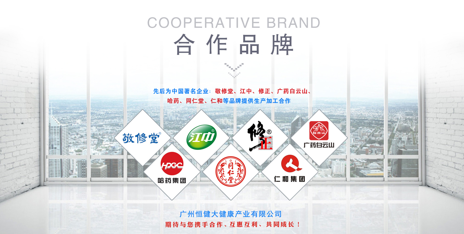 广州恒健大健康产业有限公司是成立于2011年,是一家专业代加工、贴牌(OEM)大健康产业产品的国企公司,隶属于广州医药集团有限公司。集产品、设计、研发,OEM\ODM等于一体的现代化企业,公司坚持以专业的技术、专业的品质、专业的服务,开放合作,为企业、客户提供有竞争力的产品解决方案和服务。合作的品牌:广药白云山,敬修堂,修正药业,哈药集团,同仁堂、仁和集团、江中药业等知名品牌。