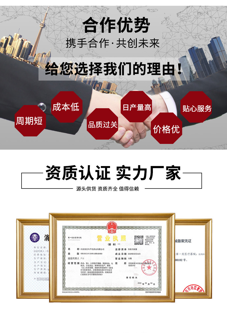 河南芦济堂生物科技有限公司是一家集研制专注膏药贴剂生产、 销售为一体的生产批发型企业 。工厂拥有8000平方米的生产车 间、设备先进,工艺合理, 质量可靠。工厂采用国际优秀管理 标准, 环境标准 CMPC 10万级车间。 公司秉承“团结同心、合 作共荣、 科技创新、 成就健康”的人文理念, 将透皮吸收理论 转入工业生产, 将中国传统文华精髓和先进科技相结合, 努力 为人类幸福生活服务。 以市场为导向争当行业先锋 ,铸就一流 品牌。欢迎各界朋友莅临参观、指导和业务洽谈。