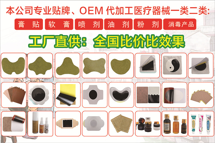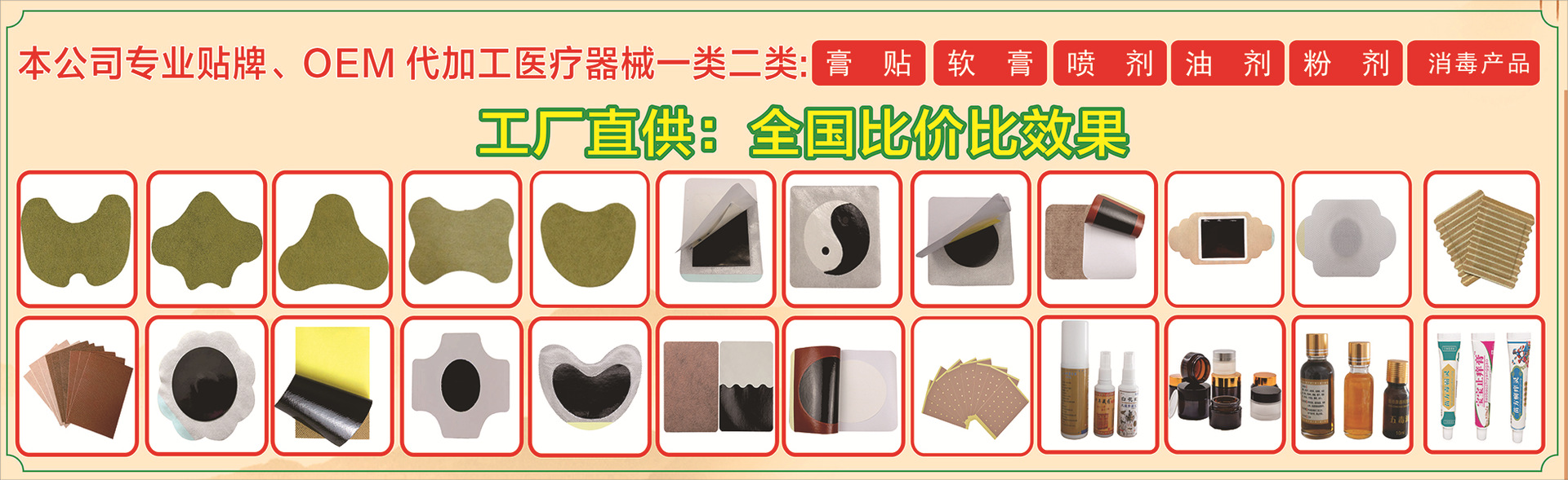 公司位于中国中部(江西)在这人杰地灵的地方生根发芽,公司专业贴牌各类外用膏贴、油剂、喷剂、软膏等,企业从小做大发展到至今已初具规模,关联工厂旗下有三个工厂占地面积近万平方,有5个集团销售公司分部各地,先后建成30万级等GMP标准无尘车间,成功获批械准字号2个,一类器械文号多个,以及各类外用膏贴、油剂、喷剂、软膏等生产许可证,12年的行业经验让公司拥有完整、科学的质量管理体系,公司拥有高科技自动涂布机,高精度切片机,自动包装机、高精度罐装机等先进设备让产品效果有保障,让消费者更放心。