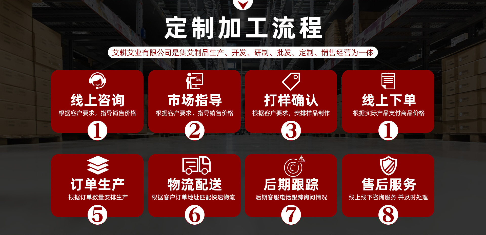 艾耕艾业有限公司坐落在风景秀丽的帝都南阳内,占地2000平方米,员工200人。艾耕艾业有限公司是集艾制品生产、开发、研制、批发、定制、销售经营为一体。多年来锐意进取致力于艾制品的不断研发。艾耕艾业有限公司以技术和质量为生存之本,不断提升技术水平和技术团队实力与规模.艾耕艾业有限公司主张开放、合作、共赢,与客户合作伙伴及友商合作创新、扩大产业价值,形成健康良性的产业生态系统,秉承“ 诚信、踏实”的企业理念,公司全力打造艾制品的领军品牌。我厂规模大、生产场地充足、生产线和各种配套设施齐备,拥有新产品研制开发、市场销售、国际贸易、包装等高级技术人才。因此,艾制品质量好、包装精美而受到国内外用户的好评。艾耕艾业有限公司的诚信、实力和产品质量获得业界的认可。欢迎各界朋友莅临参观、指导和业务洽谈。