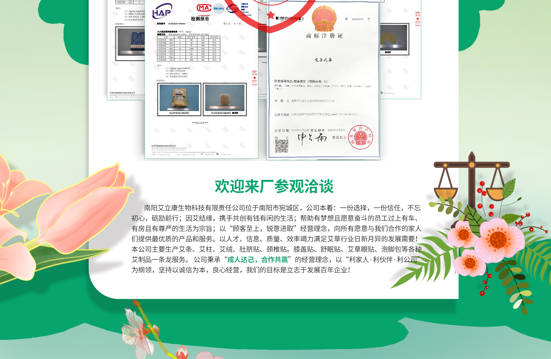 南阳艾立康生物科技有限责任公司位于南阳市宛城区,公司本着:一份选择,一份信任,不忘初心,砺励前行;因艾结缘,携手共创有钱有闲的生活;帮助有梦想且愿意奋斗的员工过上有车、有房且有尊严的生活为宗旨;以“顾客至上,锐意进取”经营理念,向所有愿意与我们合作的家人们提供最优质的产品和服务。以人才、信息、质量、效率竭力满足艾草行业日新月异的发展需要!本公司主要生产艾条、艾柱、艾绒、肚脐贴、颈椎贴。膝盖贴、舒眠贴、艾草眼贴、泡脚包等各种艾制品一条龙服务。 公司秉承“成人达己,合作共赢”的经营理念,以“利家人·利伙伴·利公司”为纲领,坚持“一帮二教三赋能”的服务宗旨,一直引领在艾草行业的前沿!